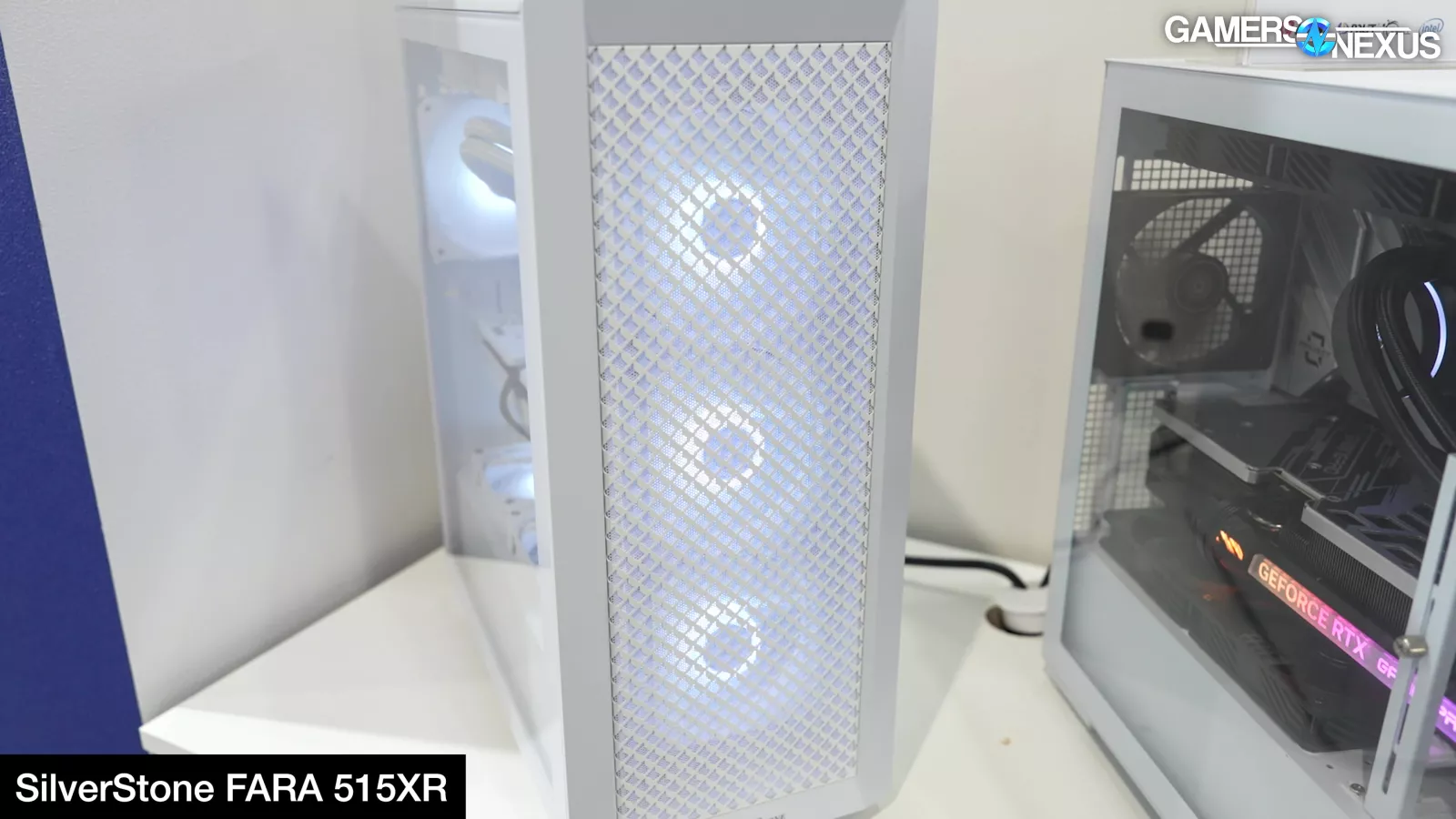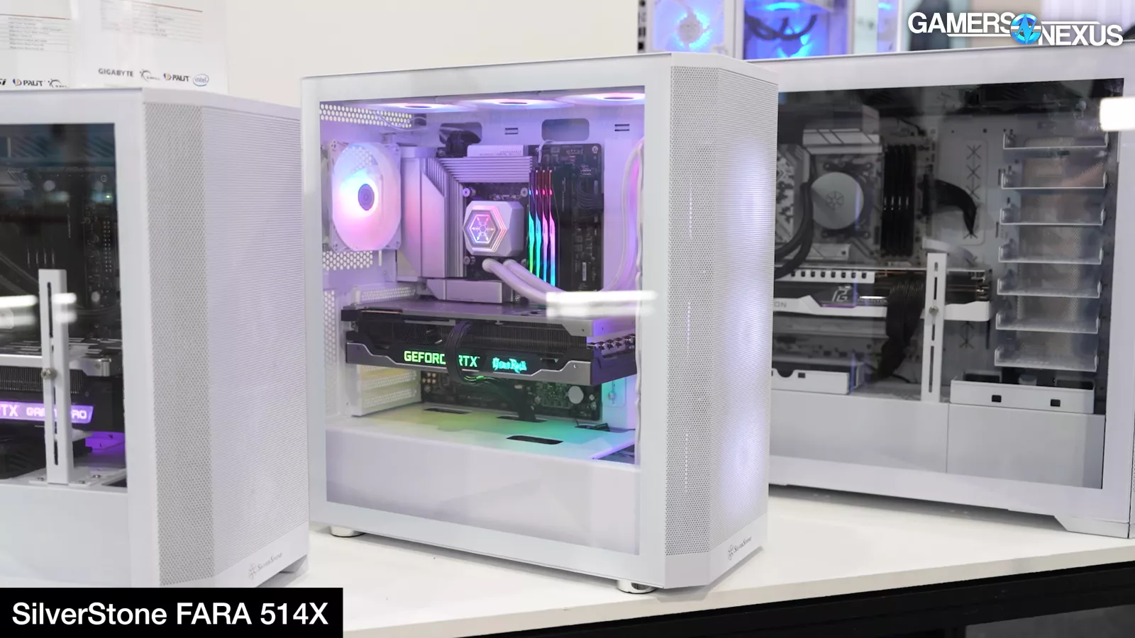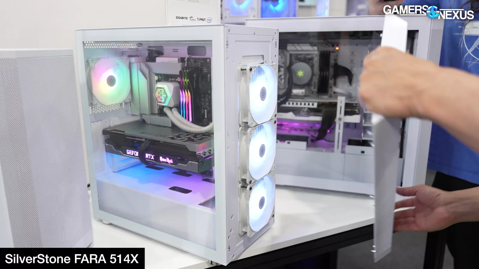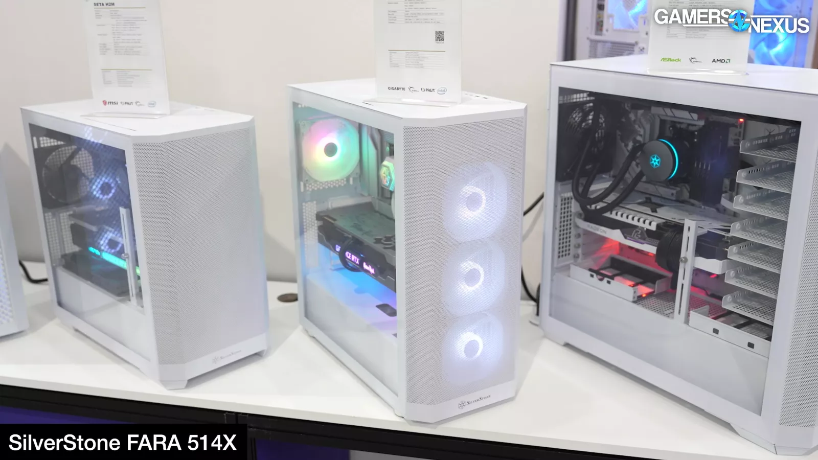 SilverStone had a number of other cases of varying affordability. You can check out our dedicated video for some of those, but we'll give a quick recap here. For the more "normal" cases, the FARA 514X will be $100 and includes 4x 120mm ARGB fans with a hub. It uses a chamfered front panel for structural support of the mesh and for enough fan clearance to support fans both inside and outside the chassis.