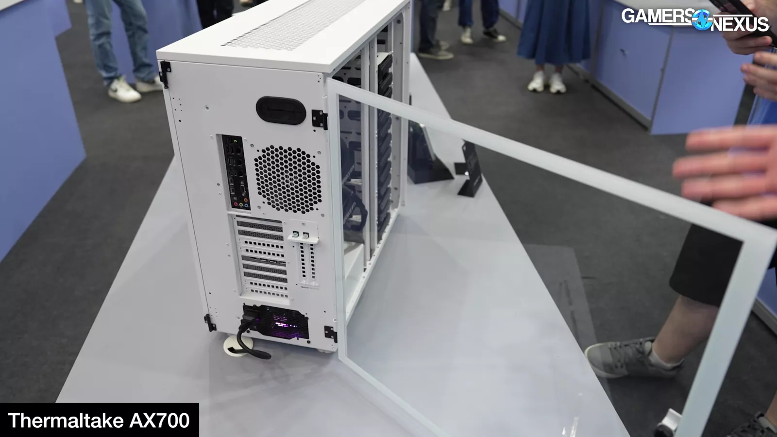 We'll change things up again. Thermaltake had a ton at its booth this year, but we wanted to highlight what’s technically an older case. The Thermaltake 100 case has had its tooling refreshed for the new AX700 workstation case. The case is an absolute monster and it remembers why big cases exist. Rather than a big empty glass cube, Thermaltake still includes a lot of drive cages. The show build had space for 12 hard drives mounted to the vertical rail, but another 2 drives could be mounted without the radiator in the way, and the backside of the motherboard tray would support at least another 2 drives from what we could see at the show.