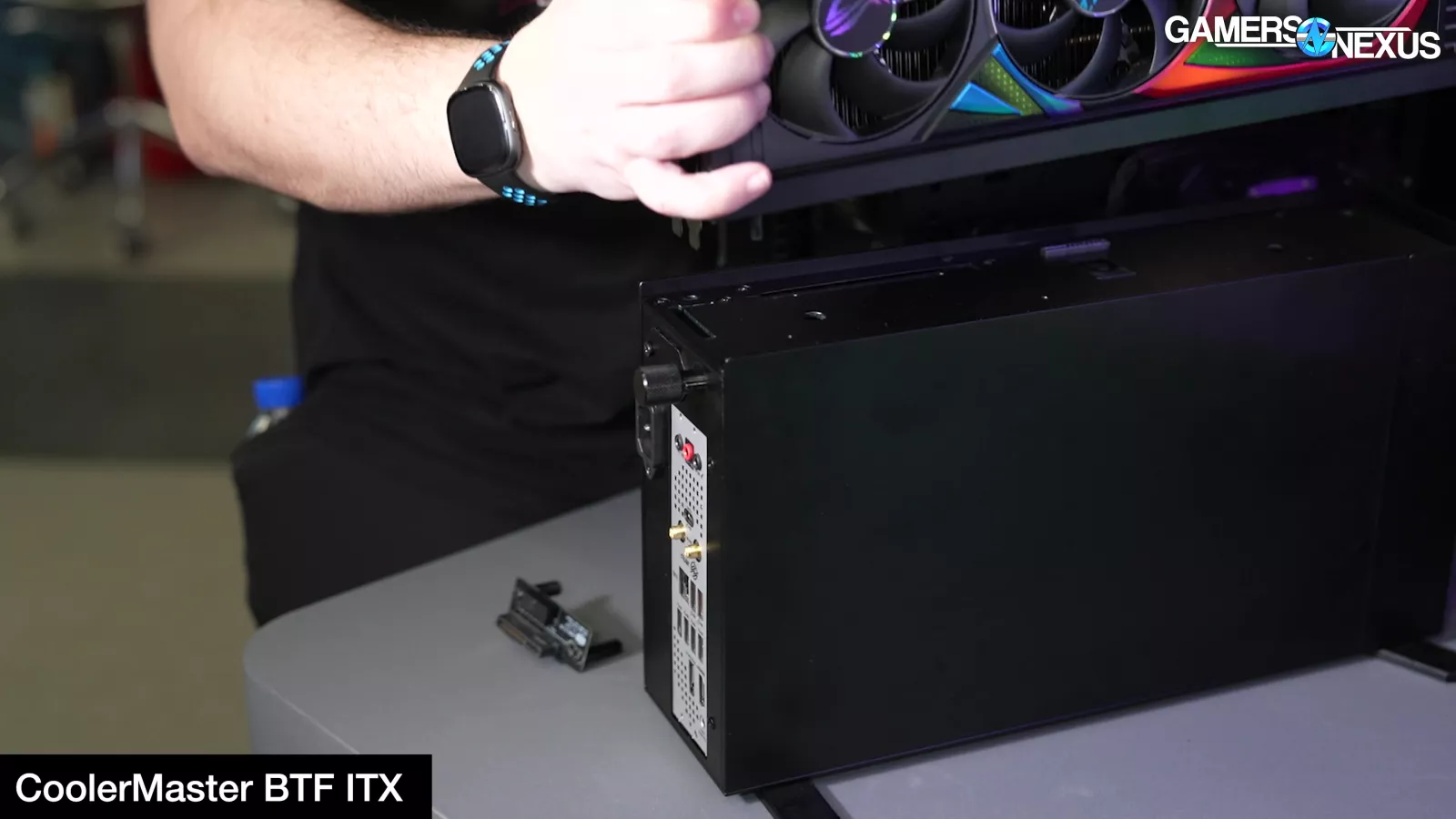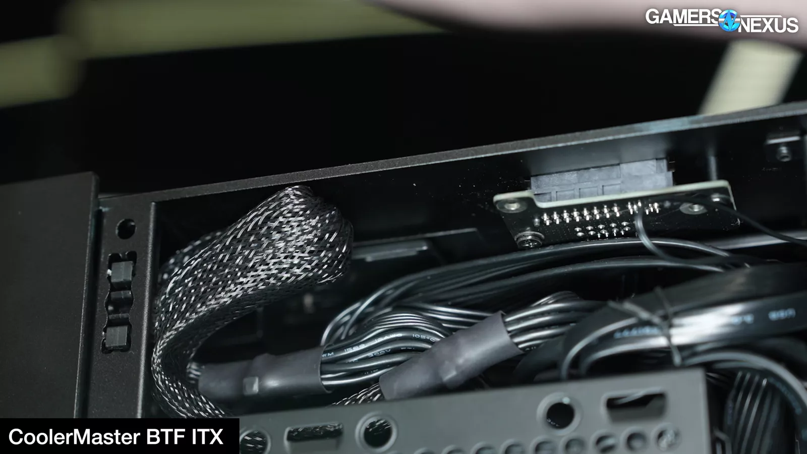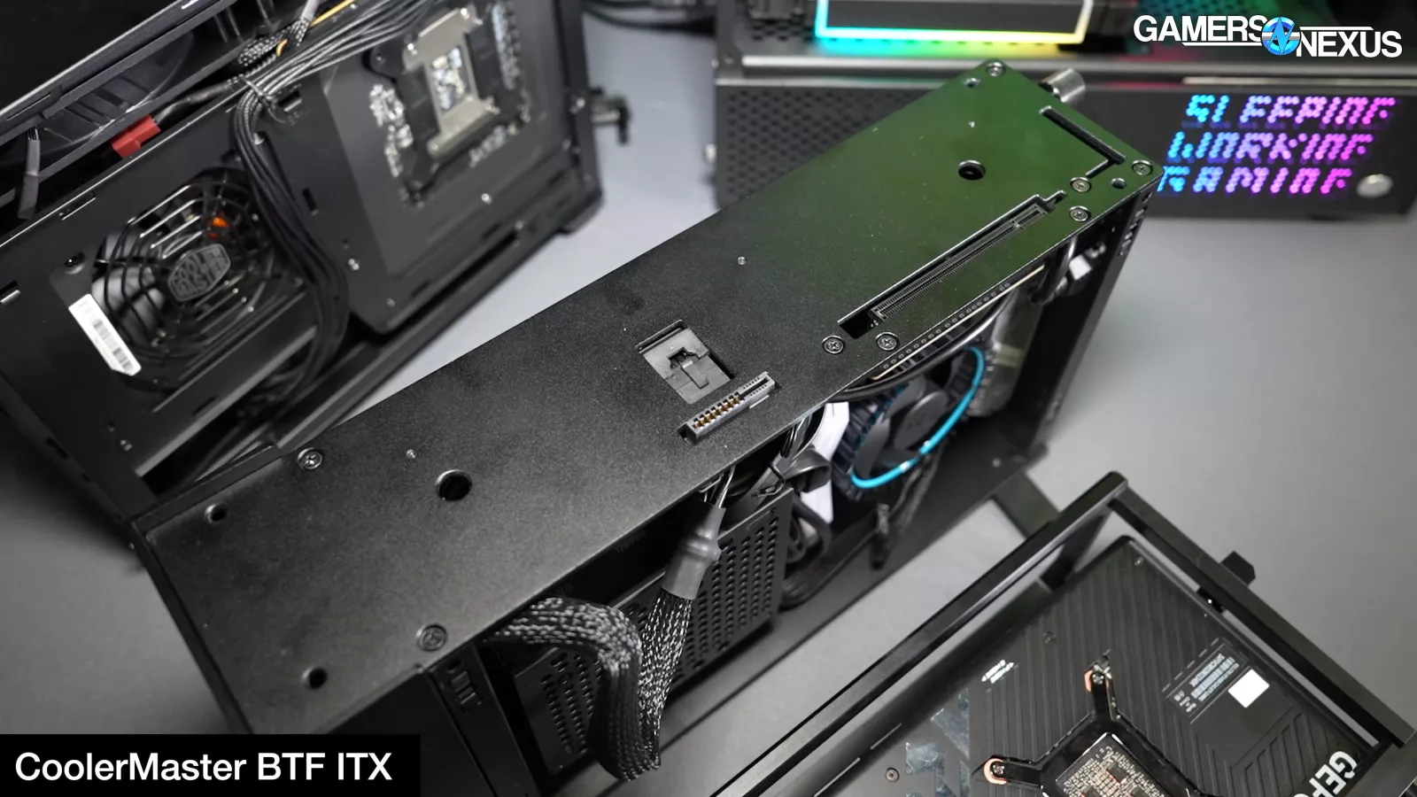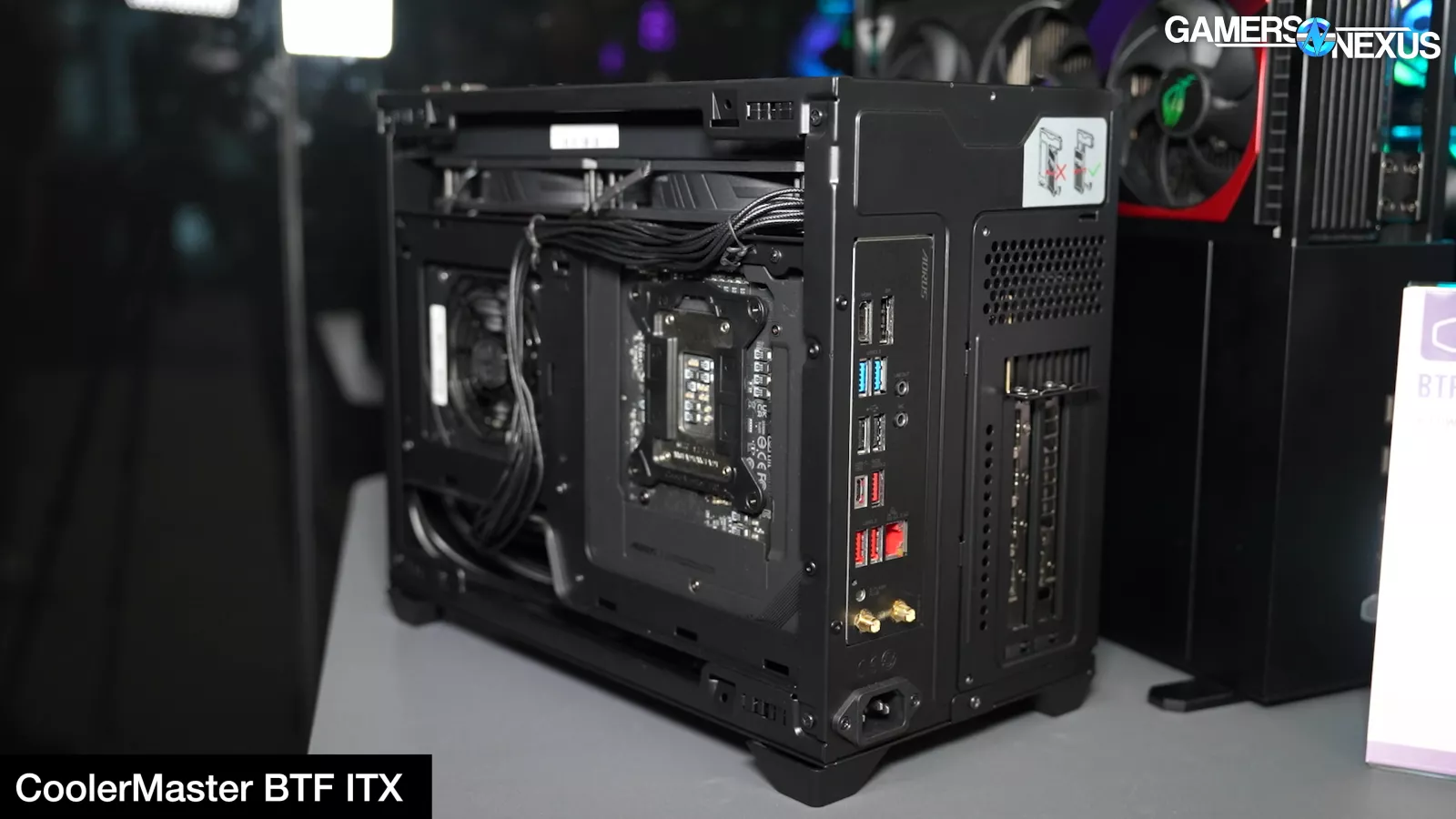 Cooler Master's mini-ITX concepts start us off. The unnamed BTF ITX concept case is currently built to enclose the GPU in a cage atop the main body and present it openly. Although shown with the ASUS BTF solution to run power into the foot of this particular GPU, Cooler Master intends to optionally punch a hole for the GPU power cable to come up through the chassis.