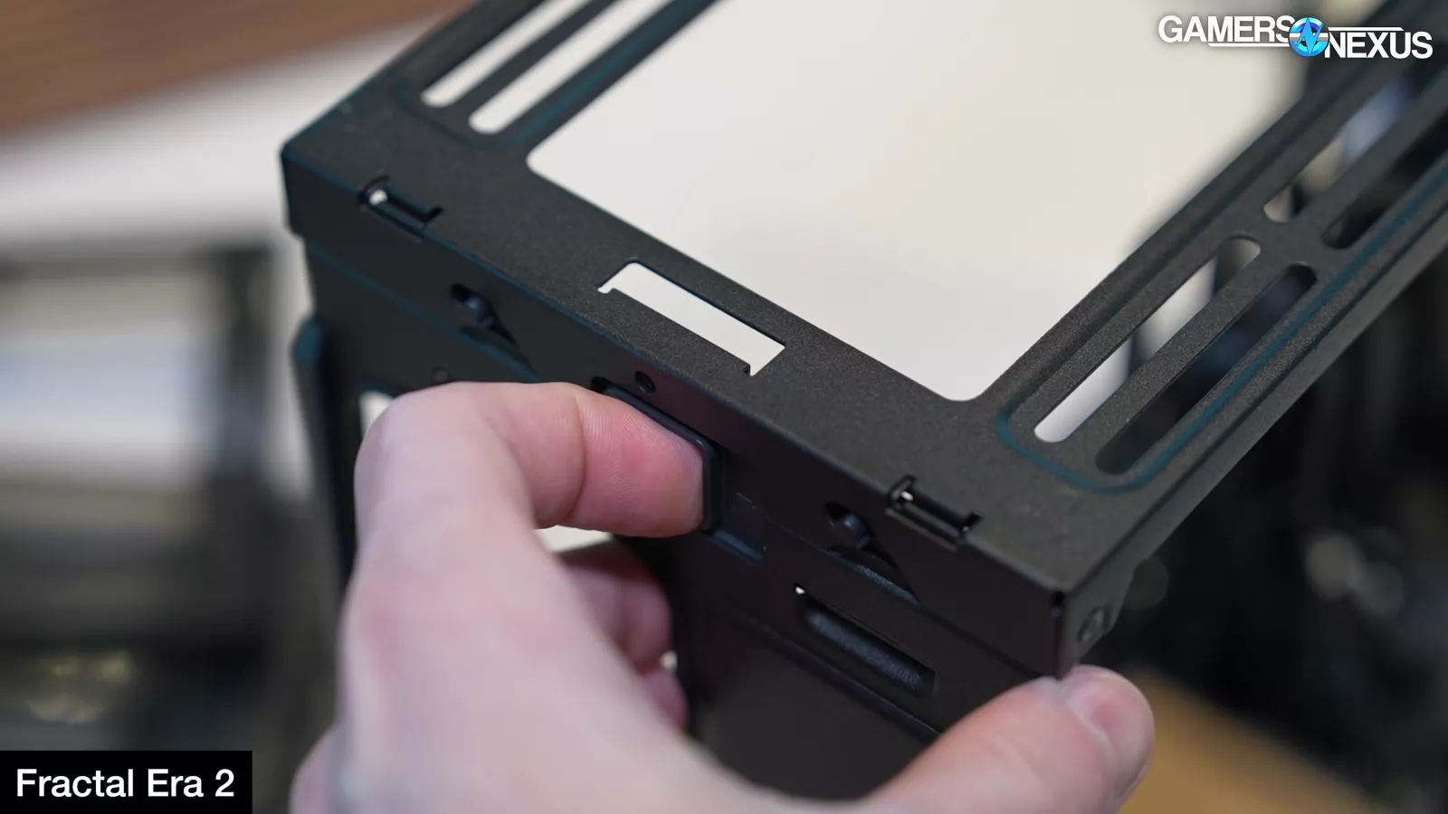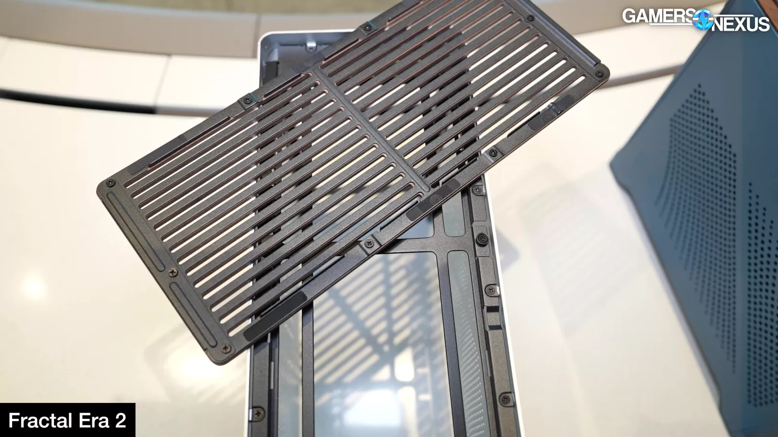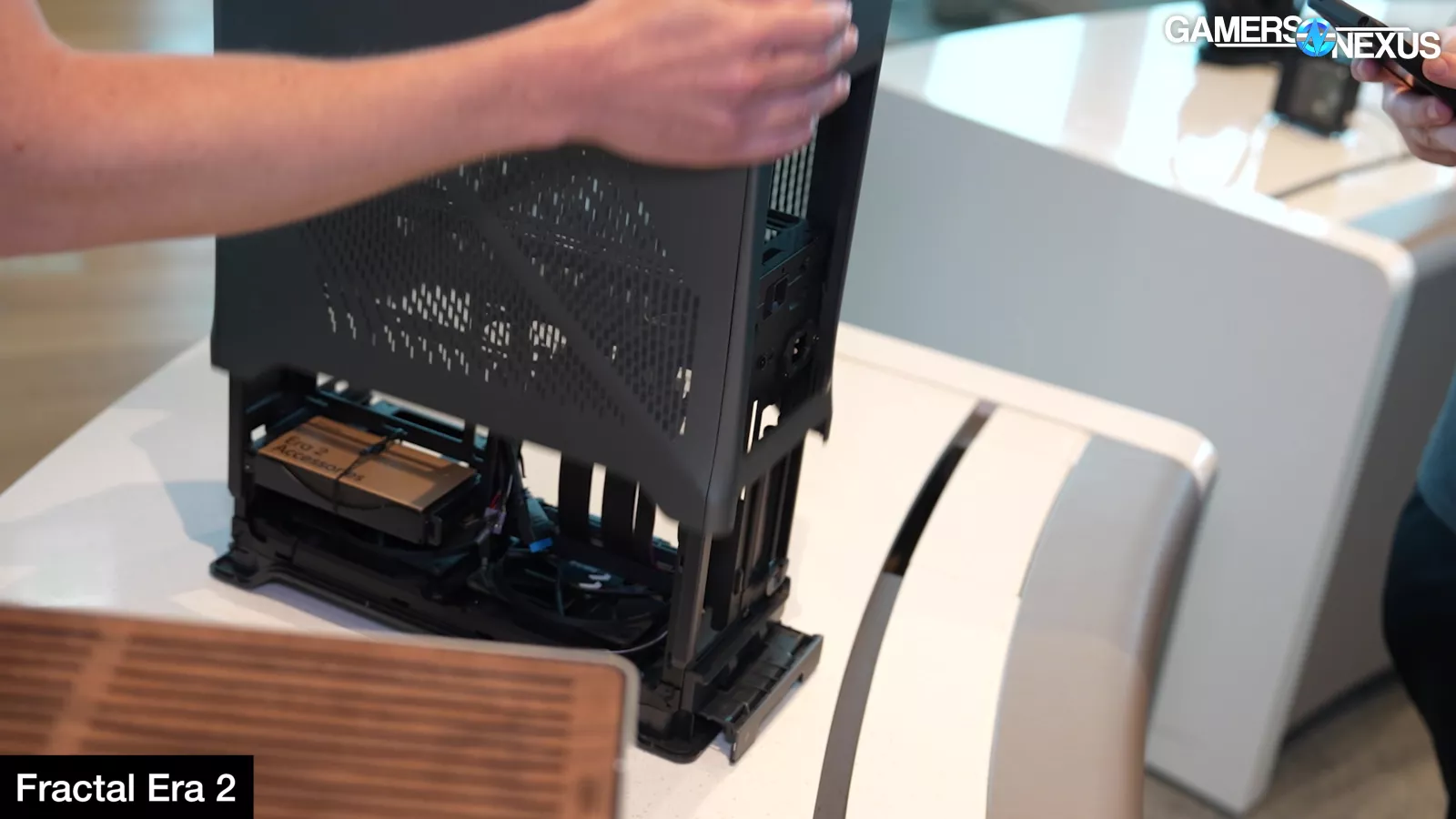 The Era 2 has clever mechanical design to allow the exterior chassis to easily lift off after a bottom filter is unseated, making the chassis easy to get into for building or maintenance. The top panel also has some mechanical latches that release it for full access inside the case. It’s an 18.9L case with 2x 120mm basement fans included, a PCIe Gen4 riser, and a Terra-style spine that shifts slightly side-to-side to better accommodate GPU or CPU cooler clearance.