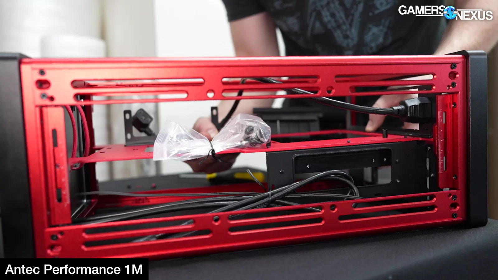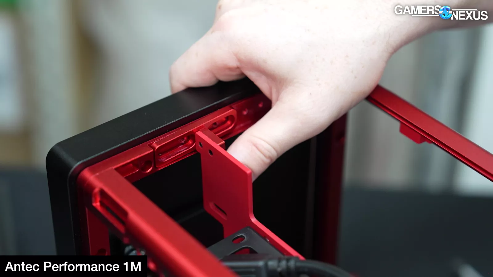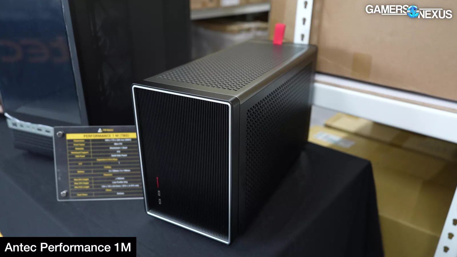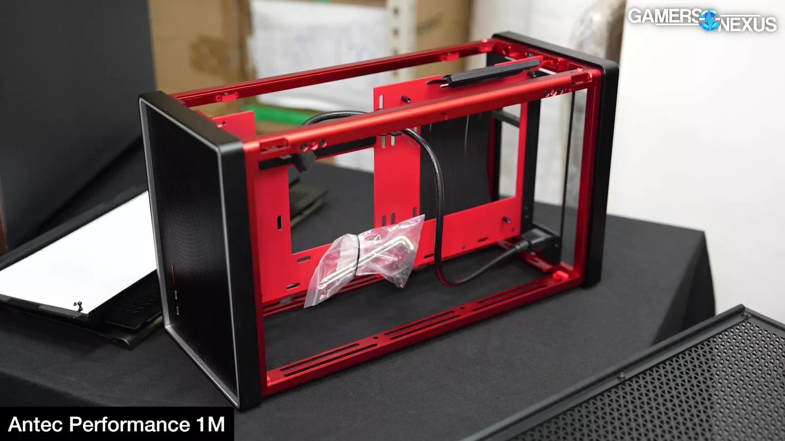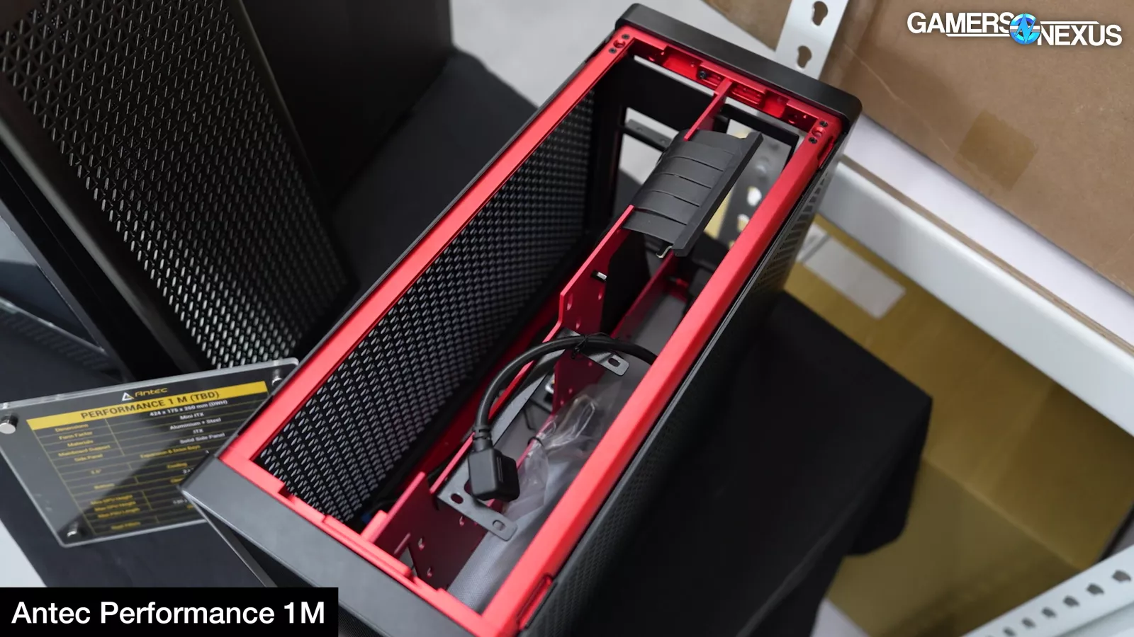 Finally, Antec also had an ITX case present: The Performance 1M uses a red interior frame and a mixture of aluminum and steel to create a back-to-back style ITX build. From our hands-on with the prototype, the mechanism isn't as refined as the Terra, but we did like the red accent and saw potential in the design. The case fits a 3-slot GPU with adjustable depth to bias toward the CPU or GPU cooler, as with the Terra and other similar cases. Antec is still finalizing the case.
