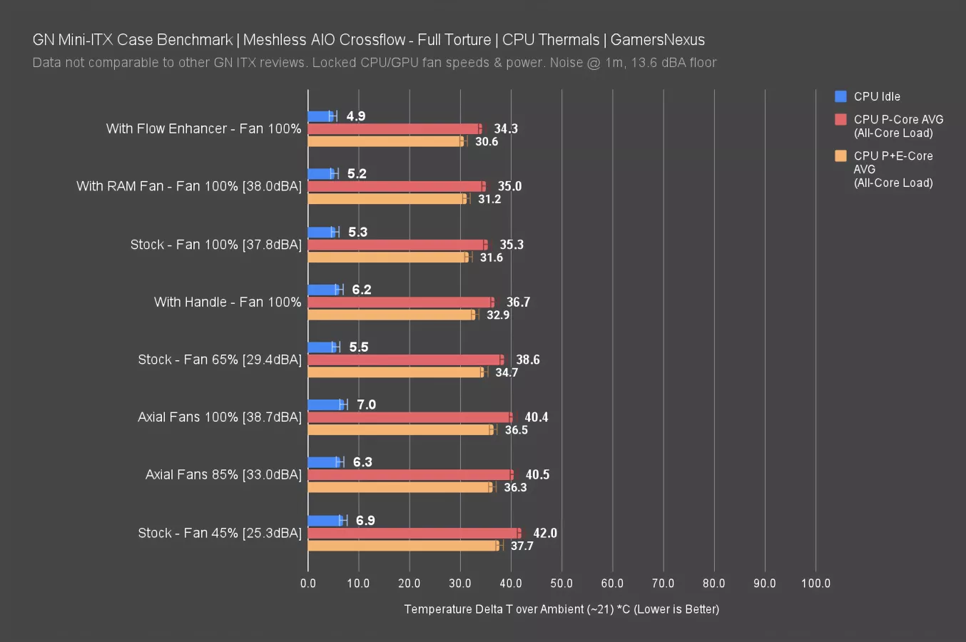Because this case wasn’t designed for axial, the fans are blocked around the edges when held in place. It’s not a fair comparison, but we still wanted to run it out of curiosity.