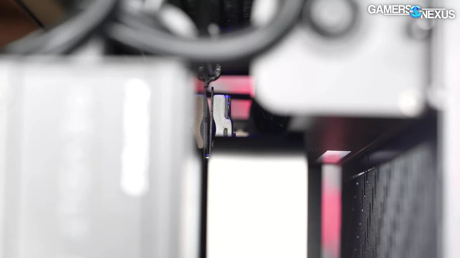 The 2.5” drive mount can hold two drives at an angle between the motherboard and PSU and is secured with a single screw. Above that, there’s a hook to help keep the CLC’s tubes in place.