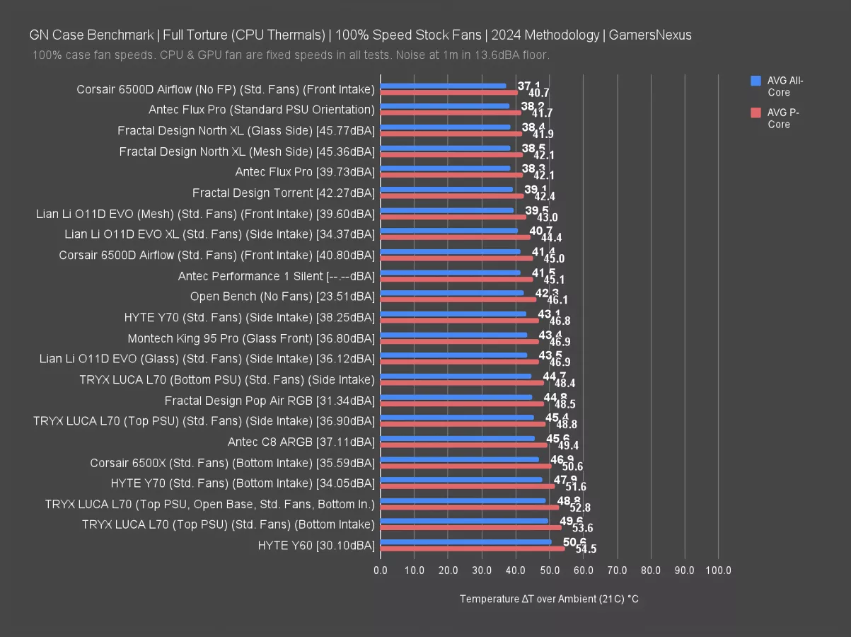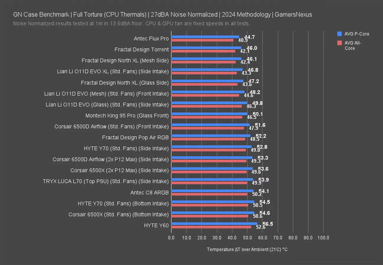 The O11D EVO XL under the same conditions was even better, up at 43 degrees all-core -- and that’s with the same fans at the same noise levels, so it’s as like-for-like as it can be. This is a test that favors traditional front-to-back airflow: the bottom-intake C8 is tied with the L70, while the new Flux Pro has a significantly lower all-core average of 41 degrees above ambient.