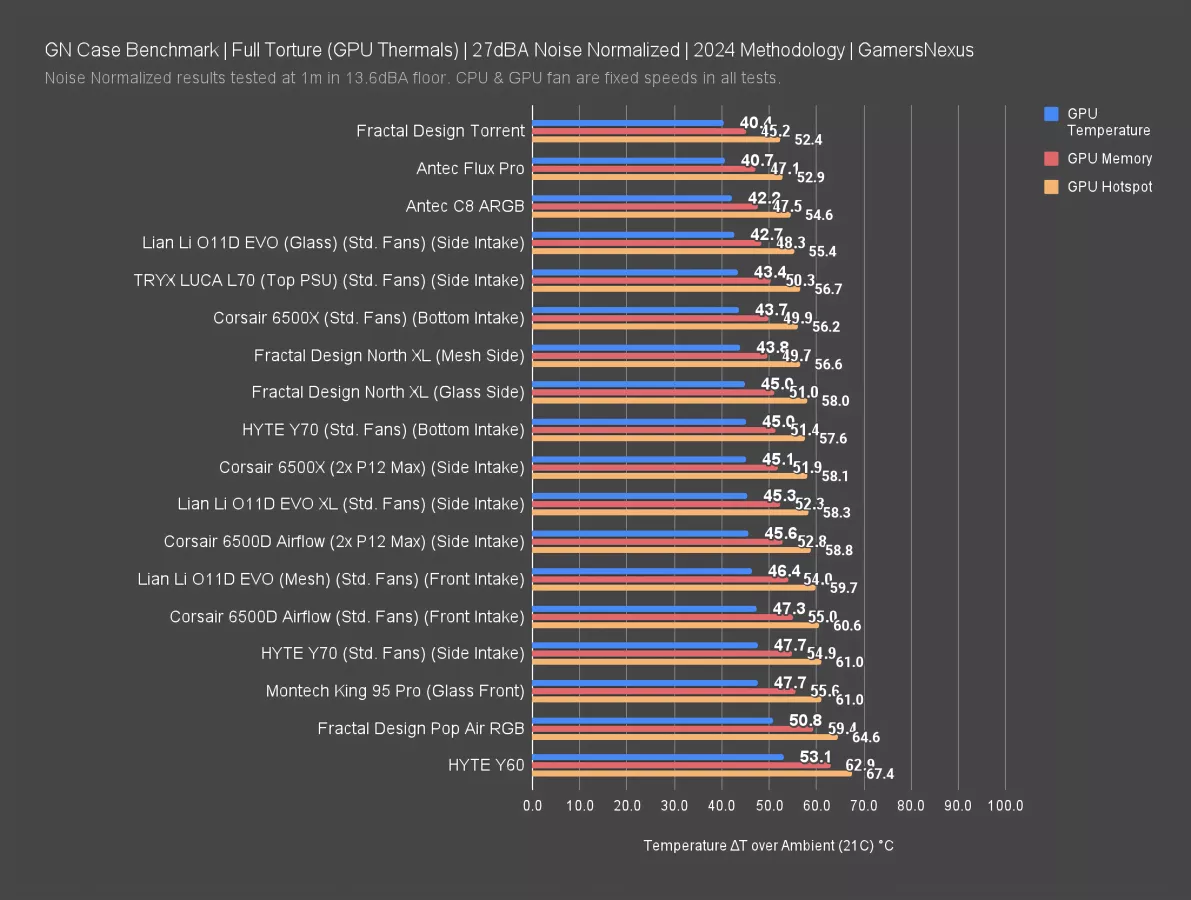 Back to the noise normalized test and with stock case fans where present, the GPU averaged 43 degrees above ambient. That’s better than the O11D EVO XL side intake at 45 degrees and the Y70 side intake at 48 degrees. Memory junction and hotspot temperatures followed the same order. The other cases on this chart used their own stock fans if available, which means cases like the Torrent and Flux Pro that ship with serious out-of-the-box cooling gained back an advantage that they lacked in the standardized fan test.
