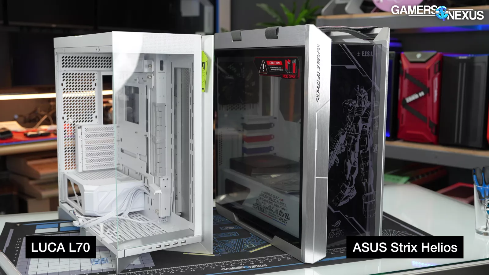 The Tryx L70 has an ASUS ROG look to it, specifically reminding us of the old Strix Helios: it's big, it's expensive, and there are huge chunks of aluminum, which is an expensive material. We weren't impressed by the Helios based on its price and thermal performance, but we've also kept one in our set background for months because, like the L70, it's impressive to look at.
