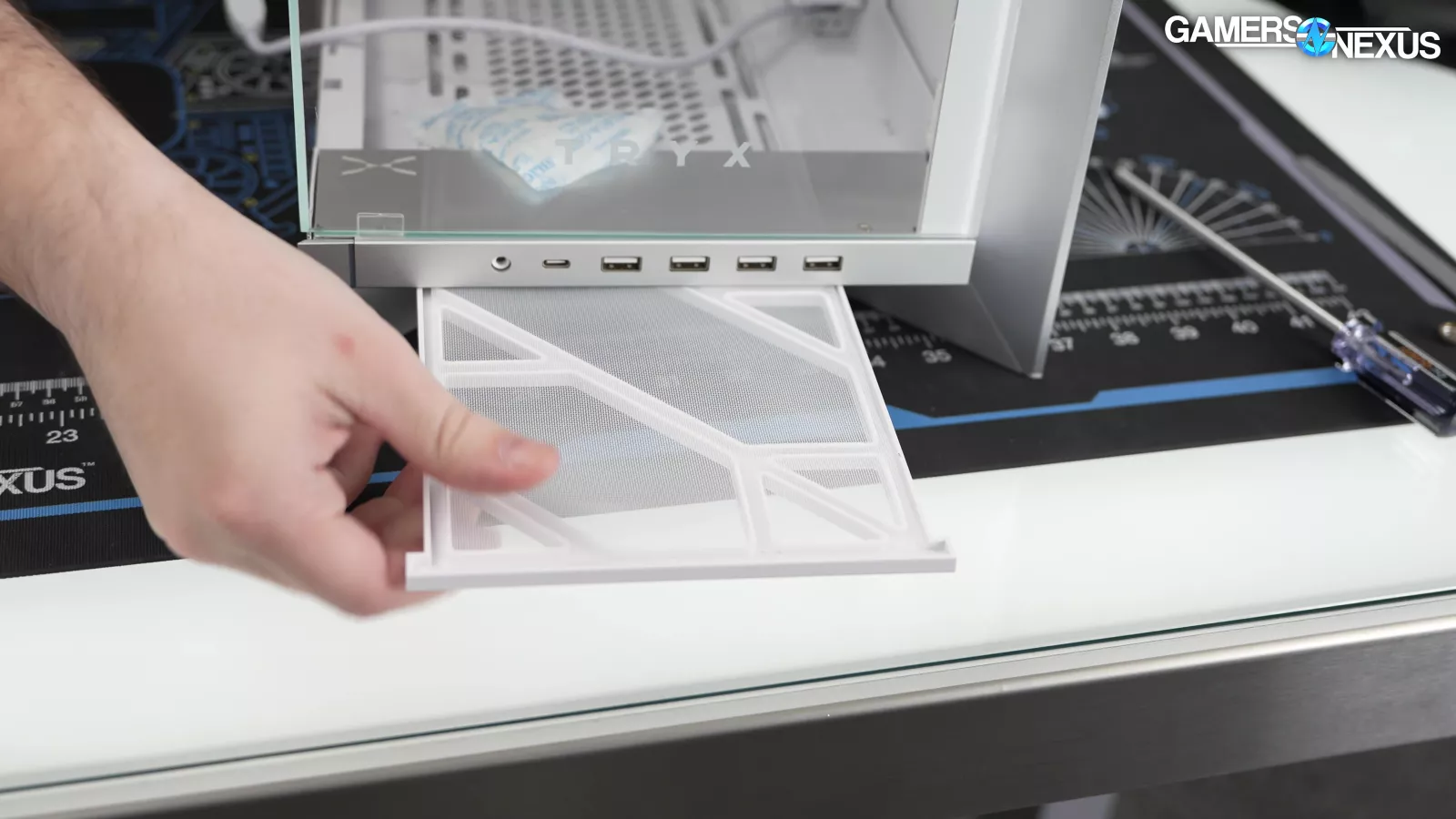 We’ll start with this one: Tryx says the LUCA is intended to use bottom-to-top airflow, but large parts of the bottom of the case are surrounded by an impenetrable aluminum curtain. The bottom fan bracket sits on top of redundant fan mounts built into the case. The bottom vent is a typical design with punched holes backed by a filter, but it would have benefited from being more open, like the Antec C8, to allow those fans to breathe.