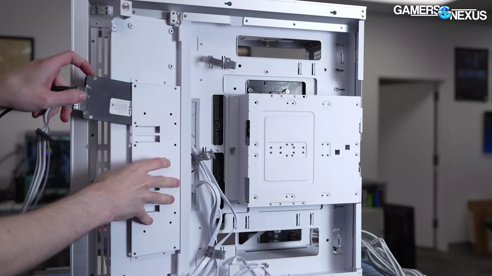 The SSD bracket can either open or close the side vent; in the closed position, the cables point the wrong way, and in the open position, cables can't fit past the other bracket. None of this was designed well in our opinion. If you do get a drive in there, you won't be able to access the cable retention clip. The other SSD/HDD bracket has raised areas that conflict with some of the 2.5" mounts, and depending on the case configuration, the slots at the back may strain your cables to their limits.