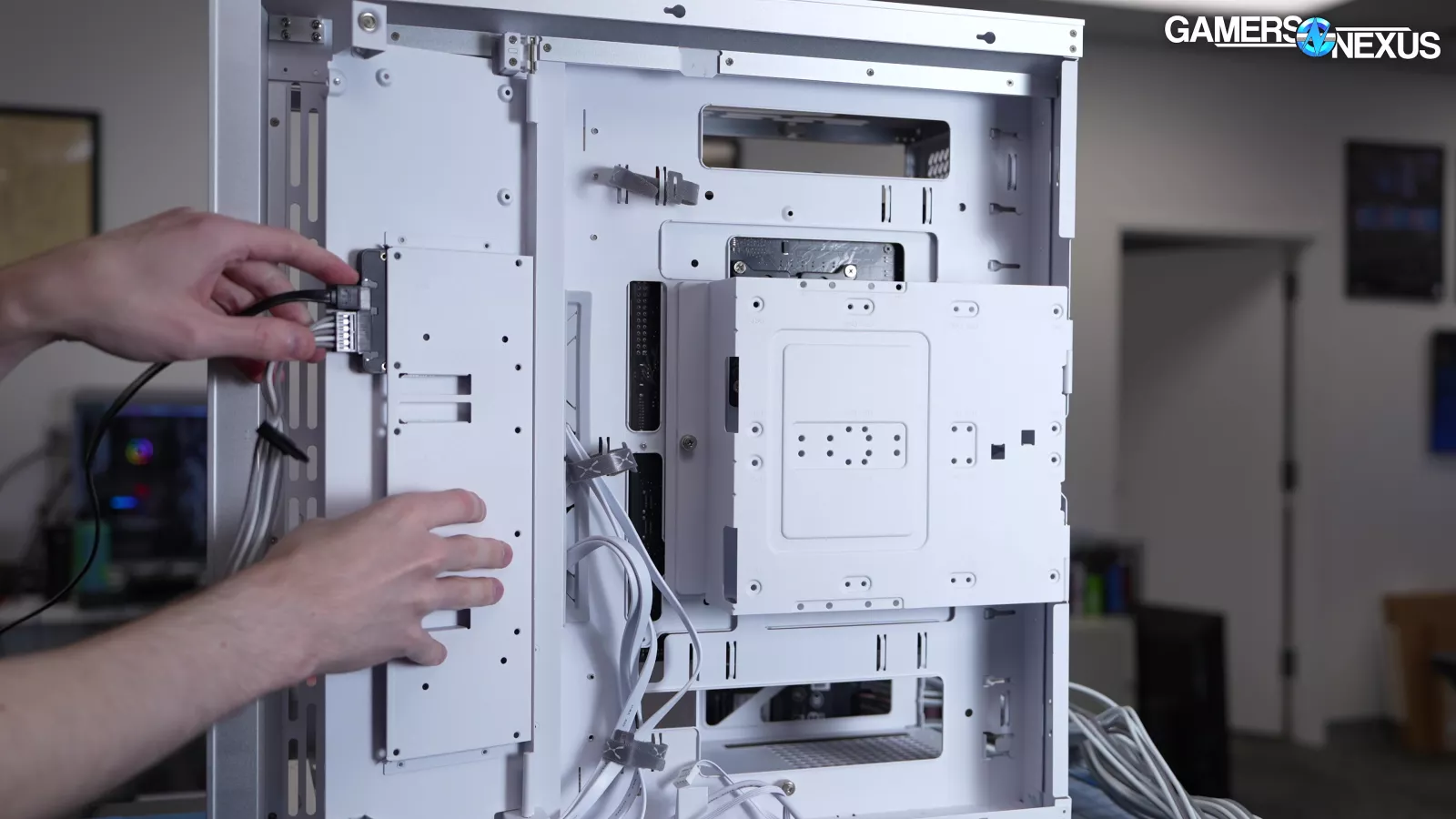 We repeatedly had problems with the I/O cables not being long enough as routed out of the box, which is worsened by needing to route cables around the hinged magnetic SSD mounting bracket. The small plate that extends the motherboard tray also made things worse; we installed it because that's what the manual shows, but at the bottom of the motherboard it partially blocks cutouts that are needed for I/O and fans, and at the top it partially blocks off cutouts that are needed for CPU power on non-back-connect motherboards. It seems like this was either never built in or not thought-through.