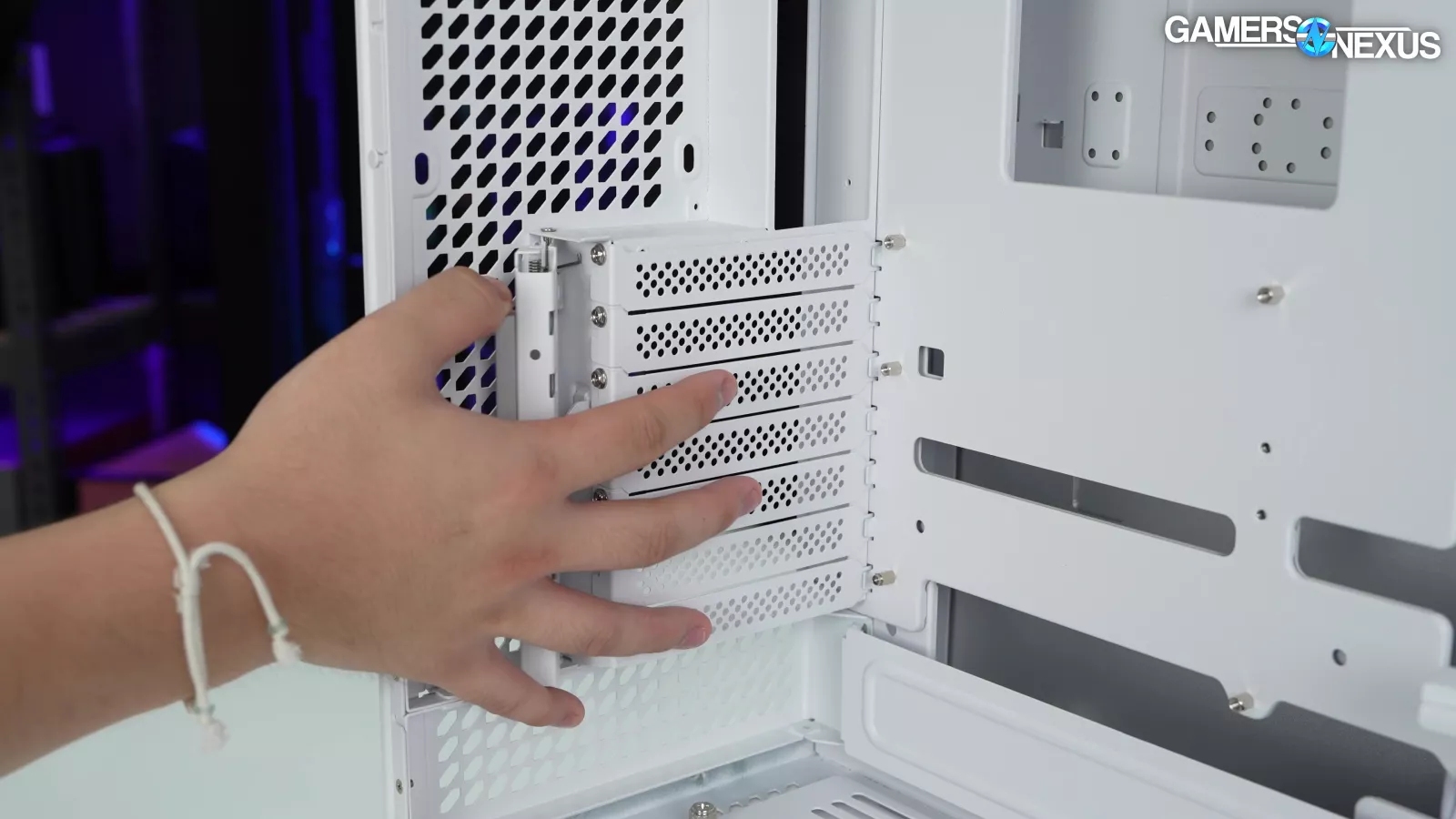 For tests with side intake through the aluminum side panel, we kept the hinged SSD mounting bracket open. For tests with bottom intake, we kept it closed.