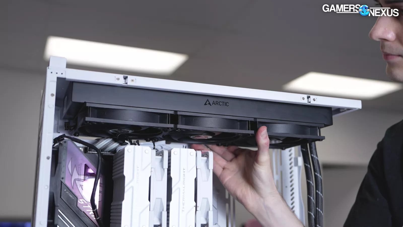 In our standardized fan tests, side intake may work well for GPU thermals, but front intake is better for CPU thermals. For example, the Flux Pro averaged 38 degrees here, and almost all of our front intake results are below 40.