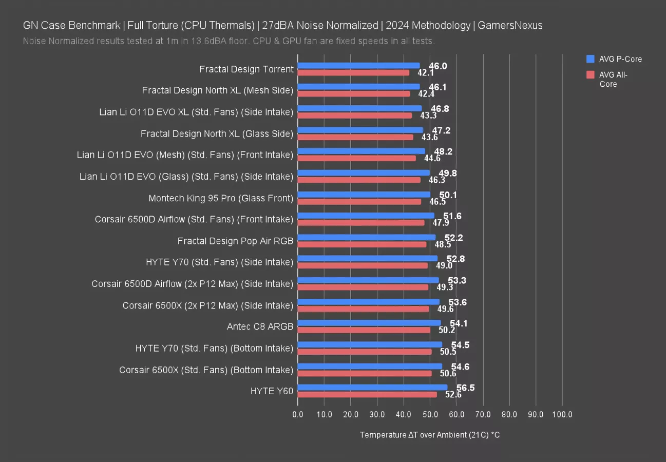 For CPU thermals amongst the Corsair cases, the straightforward front-intake configuration in the 6500D Airflow came out on top at 48 degrees Celsius above ambient for the average all-core CPU temperature and 52 degrees for the P-cores alone. The two cases were warmer with side intake, with both averaging about 49 degrees all-core and 53 for the P-cores. Bottom intake in the 6500X was the worst, since incoming air was blocked by the GPU. In total, though, the bottom-to-top range between all configurations for the all-core CPU average was less than 3 degrees within the 6500 series. The bottom intake configuration directed less noise towards our mic, which meant the fan speeds didn't need to be reduced as much to hit the noise normalized threshold, which helped to level out performance here. This is a level of precision our older methodology didn’t have, as now our chamber can identify sub-1 dB differences.