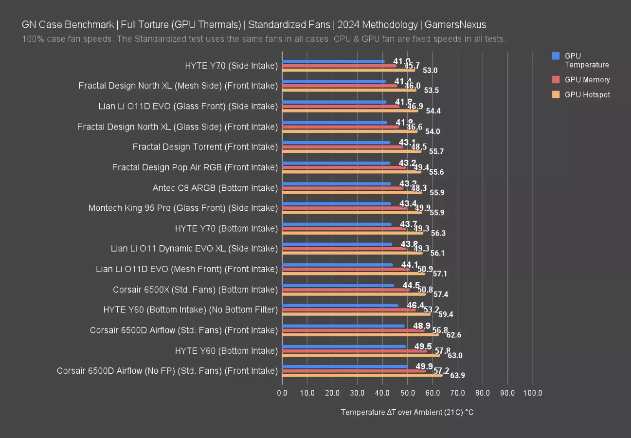 From the perspective of GPU thermals, the 6500D Airflow was both hot and loud in this test. The O11D EVO XL was about 1dBA quieter and 1 degree cooler, while the C8 ARGB and Y70 with side intake were both at least 1dBA louder and at least 4 degrees cooler.