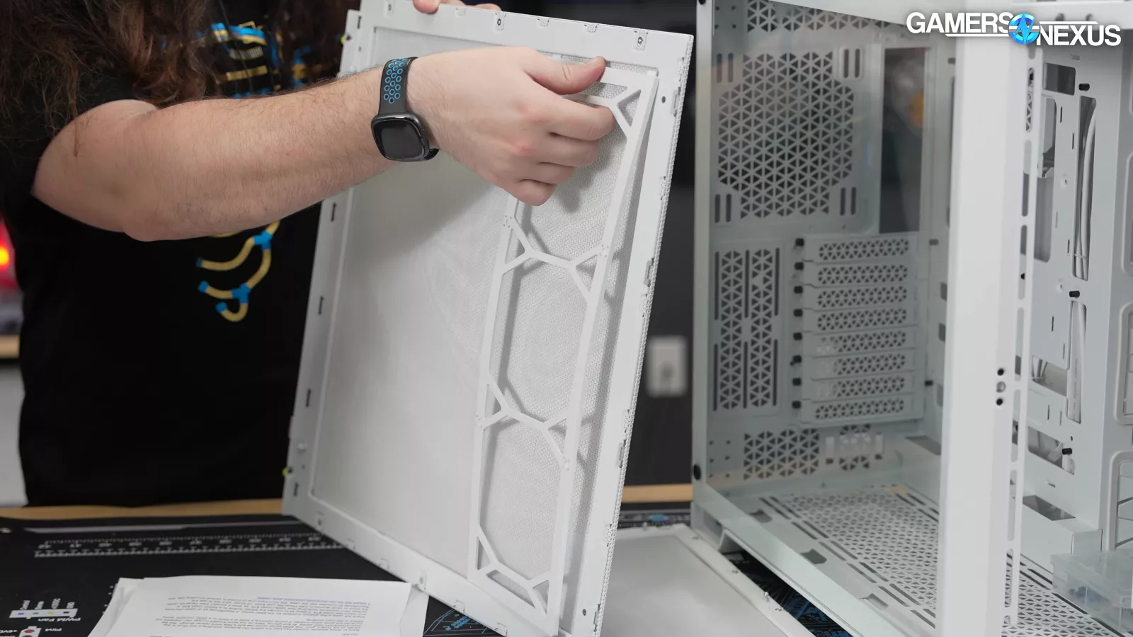 The entire front panel comes off without much more effort, although that's another thing you'll need to dig through the Corsair blogs for.