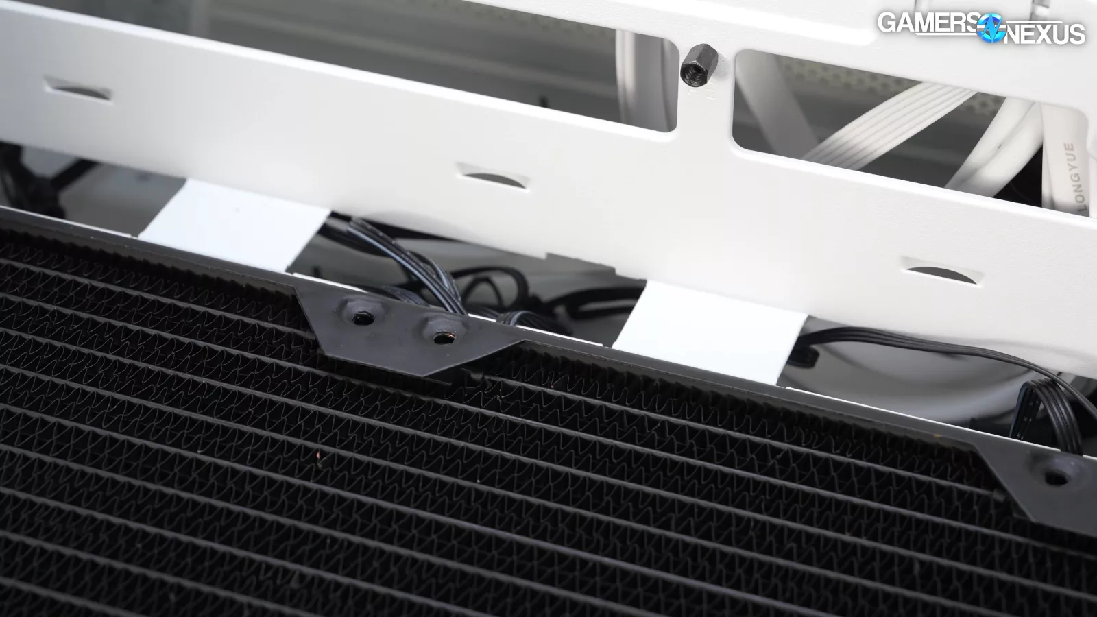 The company’s back-connect compatibility conflicts with its drive cage compatibility in ways that seems like one of the two was designed in isolation of the other. Corsair’s filters on the case are large and loose fitting without sufficient integrated support, which means they sag. To prevent this where there are fans, Corsair has included what we’ve branded as the “oh-s***-moment” with an afterthought movable plastic structure to reposition where the fans are. The filter also pulls out from under the plastic panel supports. Corsair used heavy steel in areas like the top to create a valley effect in the front panel, but then likewise went cheap on the mesh panels. Instead of reinforcing the outer edges with metal to stiffen them, Corsair used a plastic border. The end result is that every panel on this case sags, no matter how charitably you orient it. The touches of yellow accent are a nice touch that Corsair has done before, but since they didn’t follow it through in areas like the pull-tab, which they've done before, the USB ports end up just looking like an area of going cheap (despite actually spending more) because it stands out as the only point of accenting -- and it happens to be a color from PCs of the 90s. Applying this accent with more purpose would have a better effect. Open loop hardware is technically supported but not well documented, despite Corsair making its own open loop solutions.