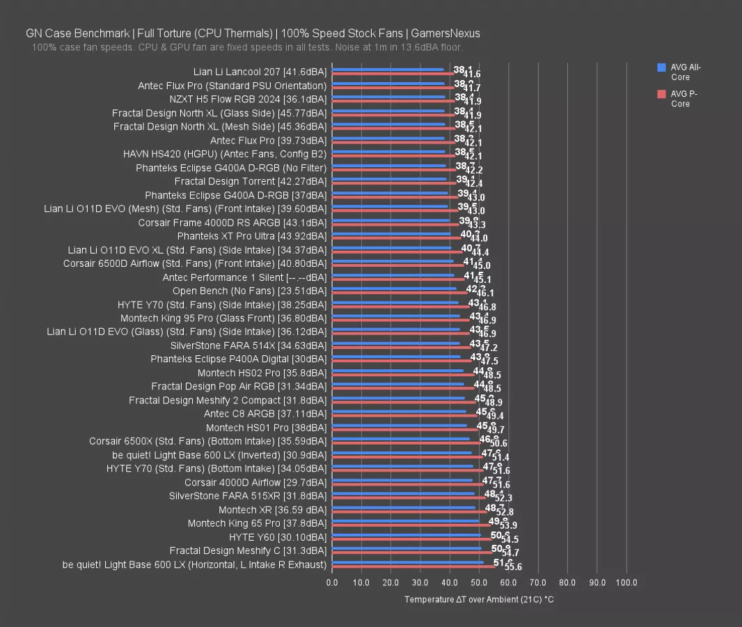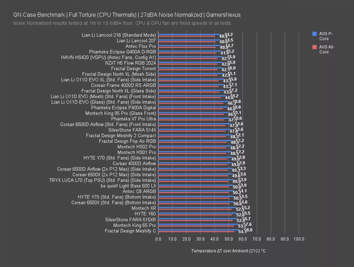 At full speed, the Frame 4000D's CPU thermal performance continues to scale fairly well for its price, while the 4000D Airflow falls further behind. The Frame 4000D's noise levels and performance were essentially tied with the Phanteks XT Pro Ultra here, with the Frame 4000D averaging 40 degrees above ambient, or 43 on the P-Cores. The G400A performed similarly as well, but with a lower 37dBA noise level to the Frame 4000D's 43dBA, while the Lancool 207 remains an outlier with both lower temperatures and lower noise levels, making it a lot better here than really most of these other cases.