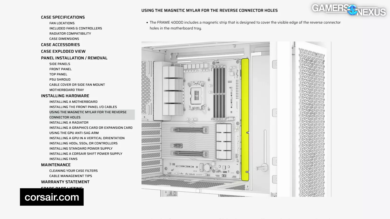 We'd like to see a paper manual included with the case in addition to the version on Corsair's blog. The benefit of the online guide is that it can be updated; for example, the online manual now explains what the point of the strip of mylar in the accessory kit is, whereas we had to email Corsair (it covers the reverse-connector holes in the motherboard tray when they're unused). A paper manual can’t be updated, which is a downside as much as it is an upside: The upside is that a company can’t gaslight a customer if something proves incompatible and is retconned. It’s also just more convenient to build a computer with a physical manual.