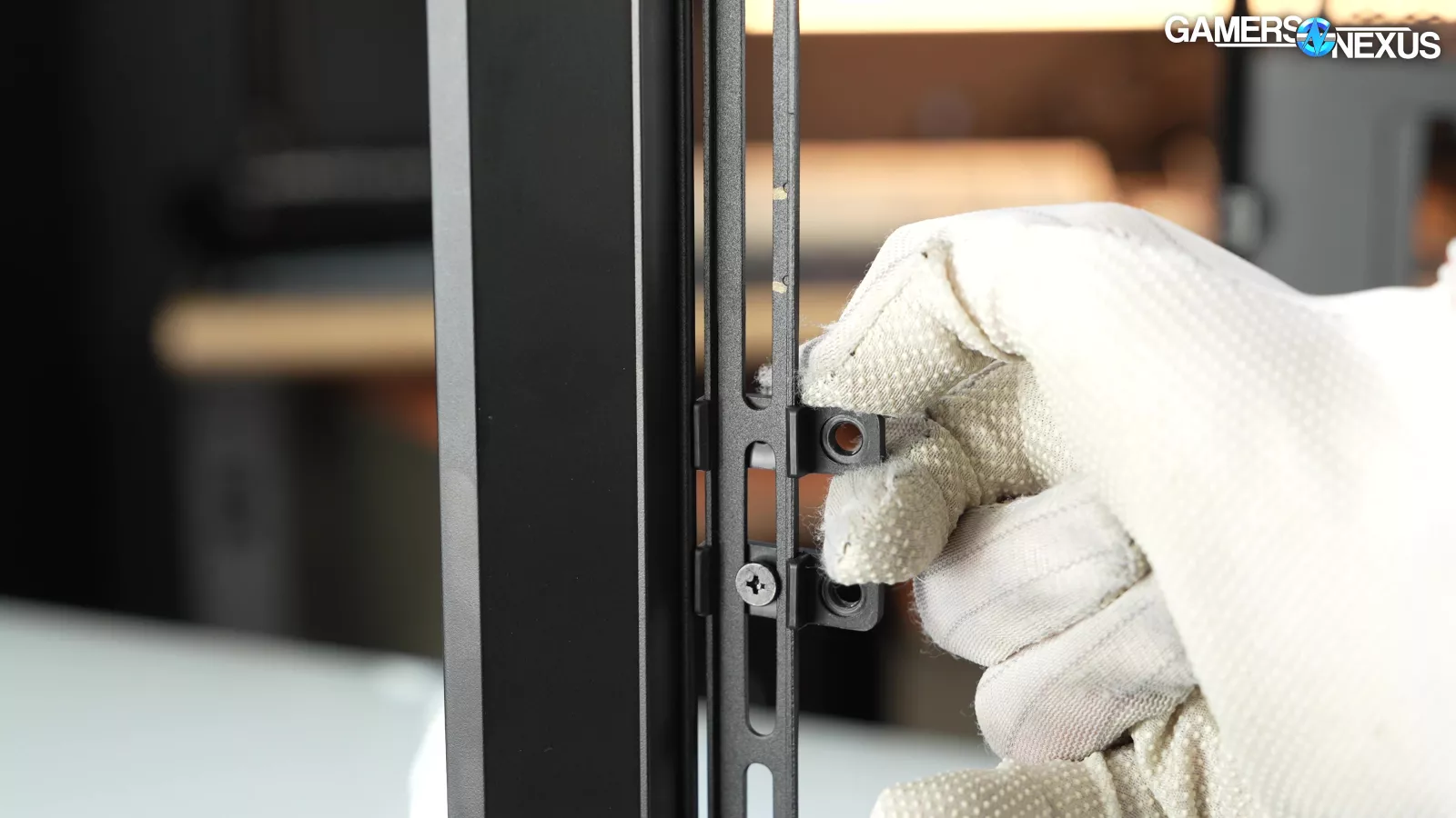 The Frame 4000D uses the so-called "InfiniRail" system. At the front of the case, there are two metal rails that hold up to 12 plastic clips. The rails slide in and out for 120mm or 140mm mounting, and the clips slide up and down the whole length of the rails. Technically, the rails can fit 200mm fans at their maximum width, but only by forgoing the clips and mounting directly to the rails.