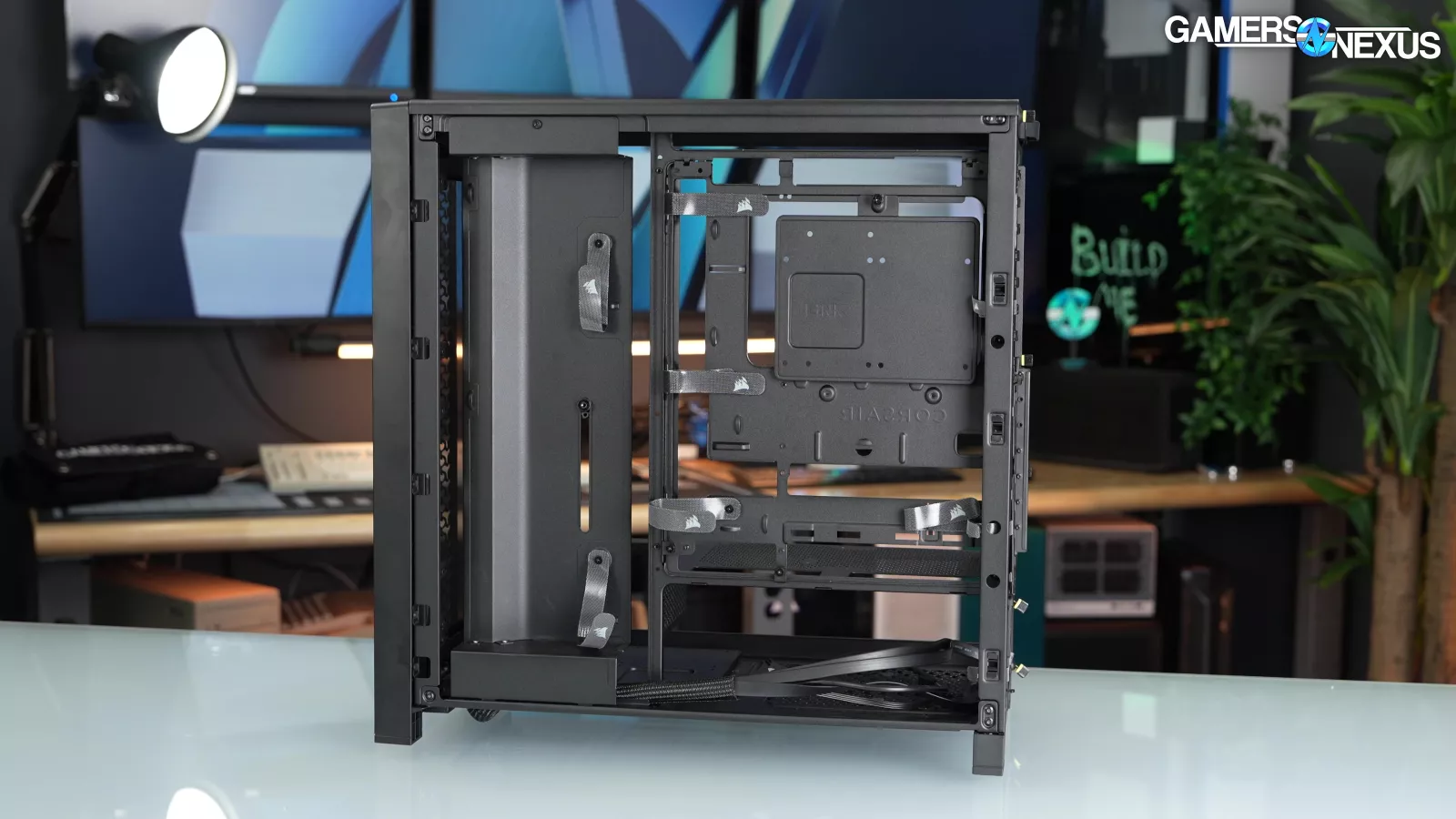 Today we’re reviewing the Corsair Frame 4000D and the case is modular in some interesting ways. For instance, the motherboard tray and power supply shroud/tray can come out. And that’s what gets us to the name “frame.” It’s a frame of a case and it can be reconfigured.