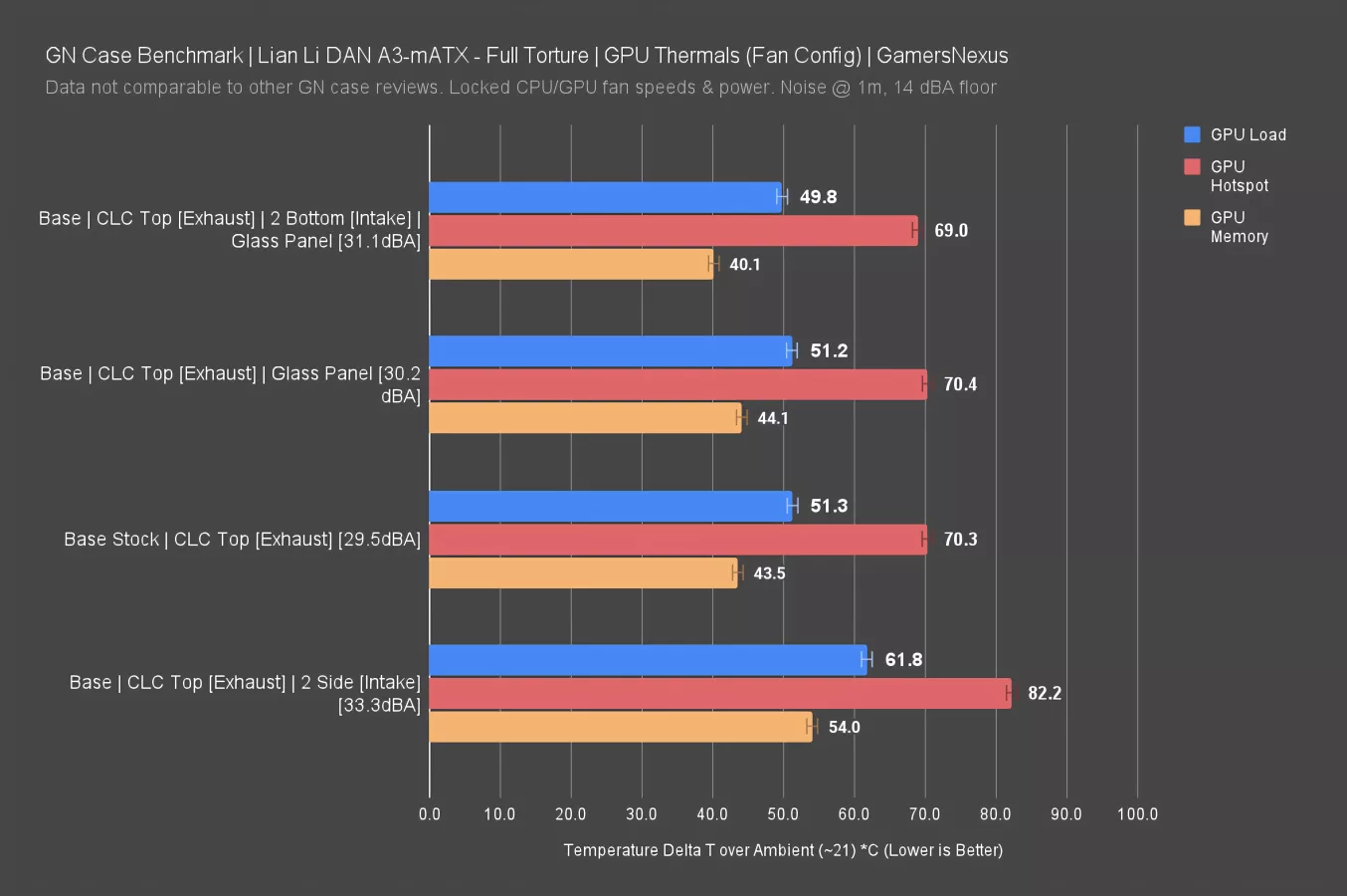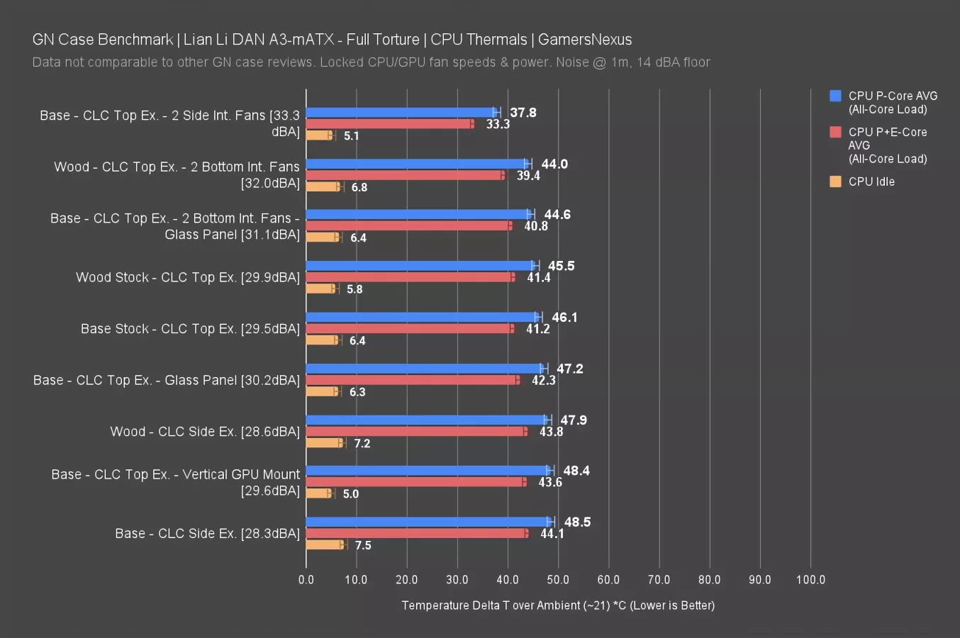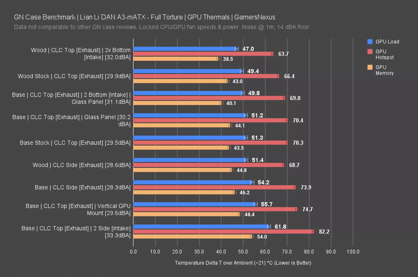 Removing the two case fans puts the case in “wood stock” configuration, which is 1.5C warmer and not bad, all things considered. Other configurations filter in below, with the base vertical GPU mount and CLC side exhaust setups coming in last at about 48C over ambient.
