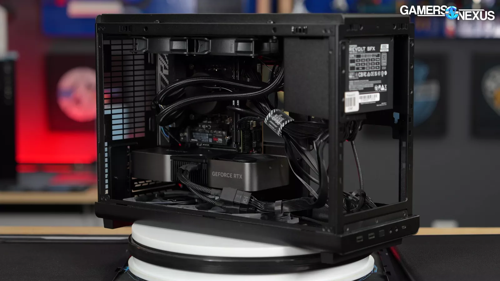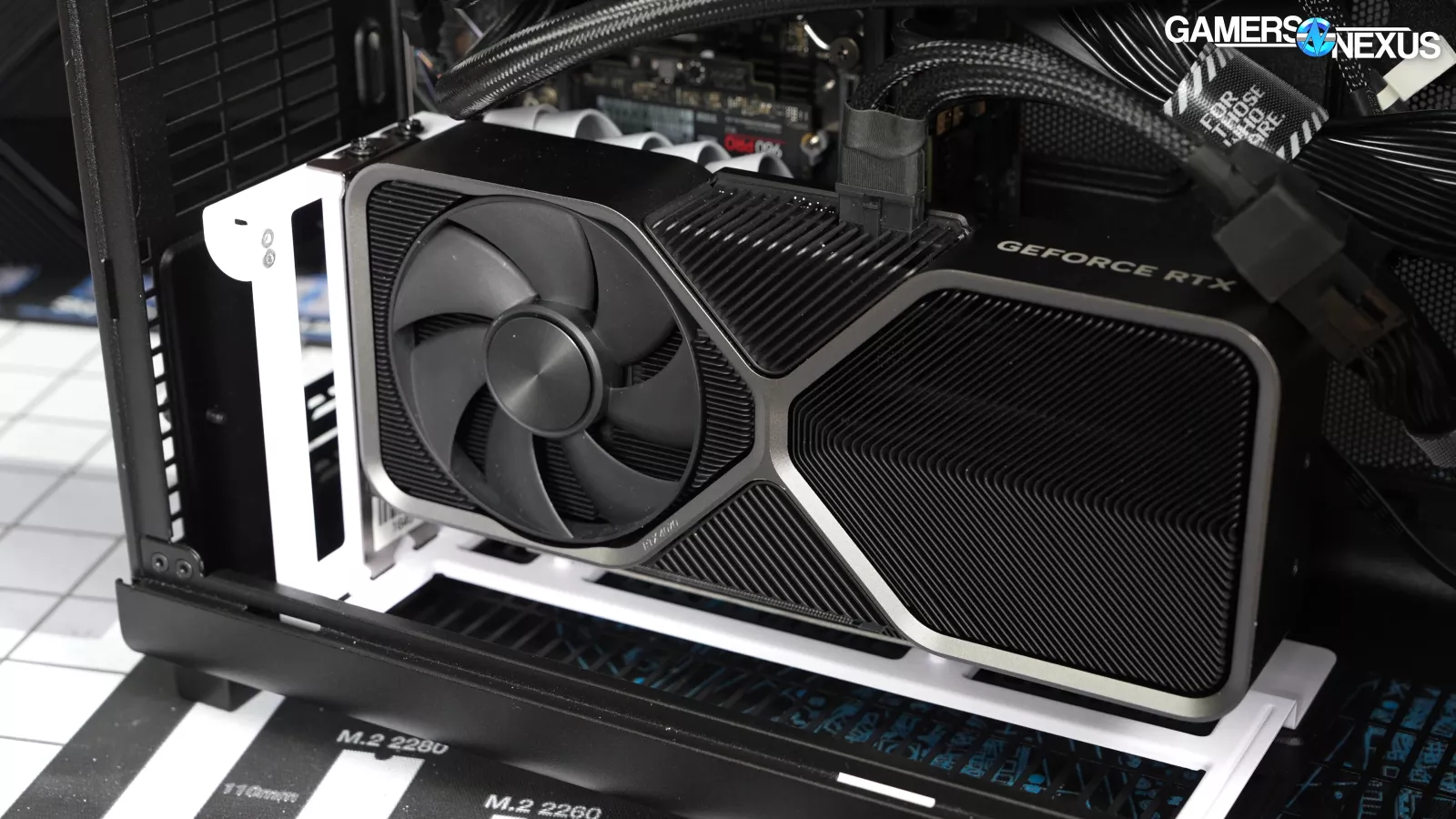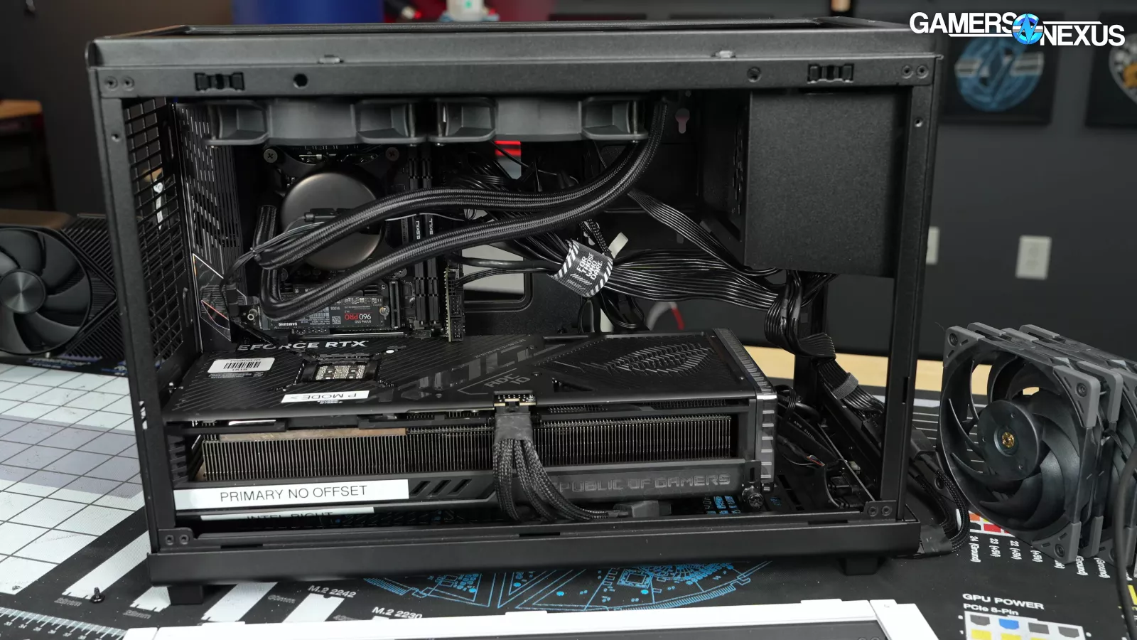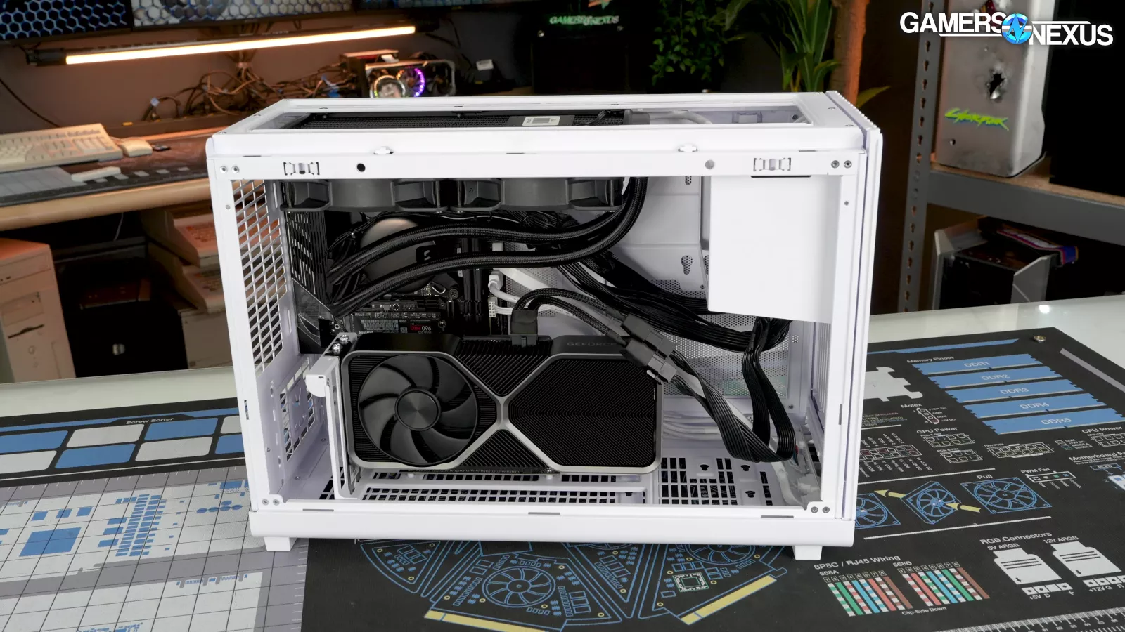 NVIDIA 40 Series Founders Edition cards have no problem fitting inside. The ASUS Strix 4090 fits, but would require careful consideration to not put pressure on the power connector. The massive Gigabyte Aorus Master just barely doesn’t fit due to how tall the card is around the PCIe bracket. But just because it fits doesn’t mean it’d be a good combination for thermals, and we’d recommend against any cards of that size in this case.