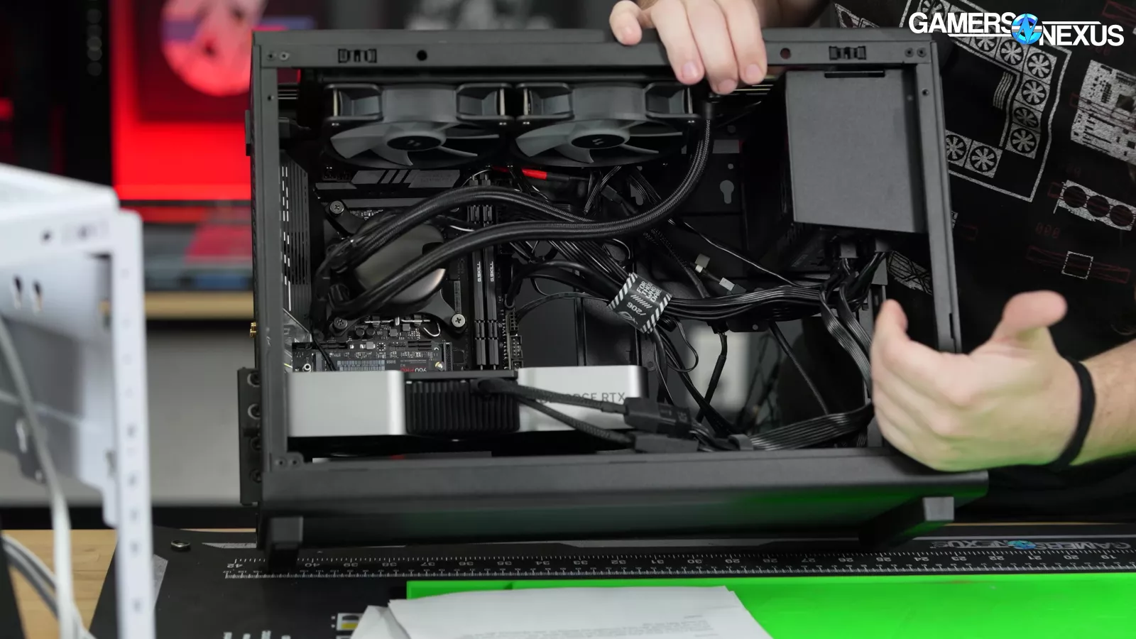The impact to GPU thermals is massive. We measured about an 11-degree drop in average GPU temperature by getting rid of the side intake, extra fans. To help make this easier to understand, we made a custom 3D animation and we’ll come back to thermals later.
