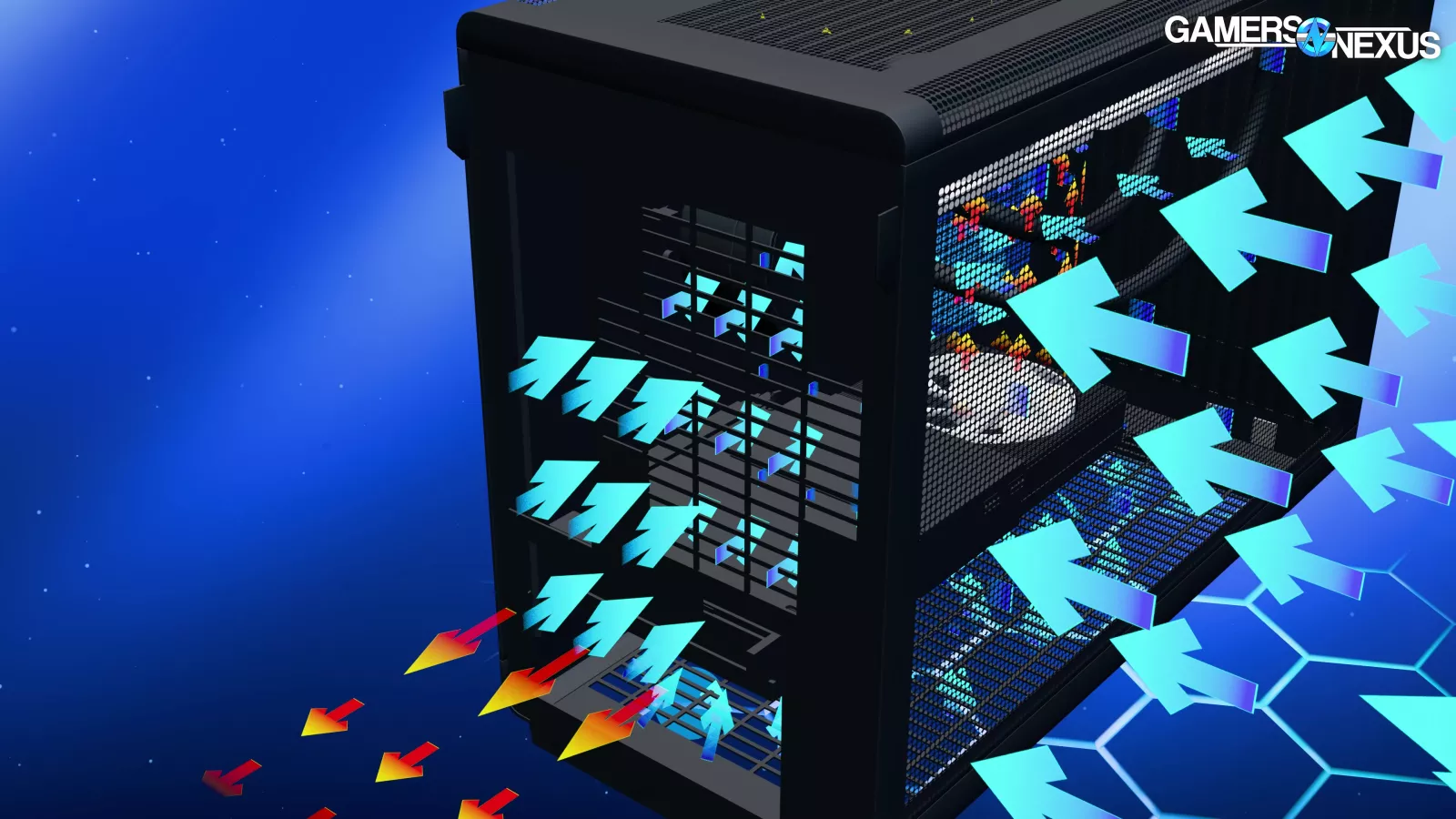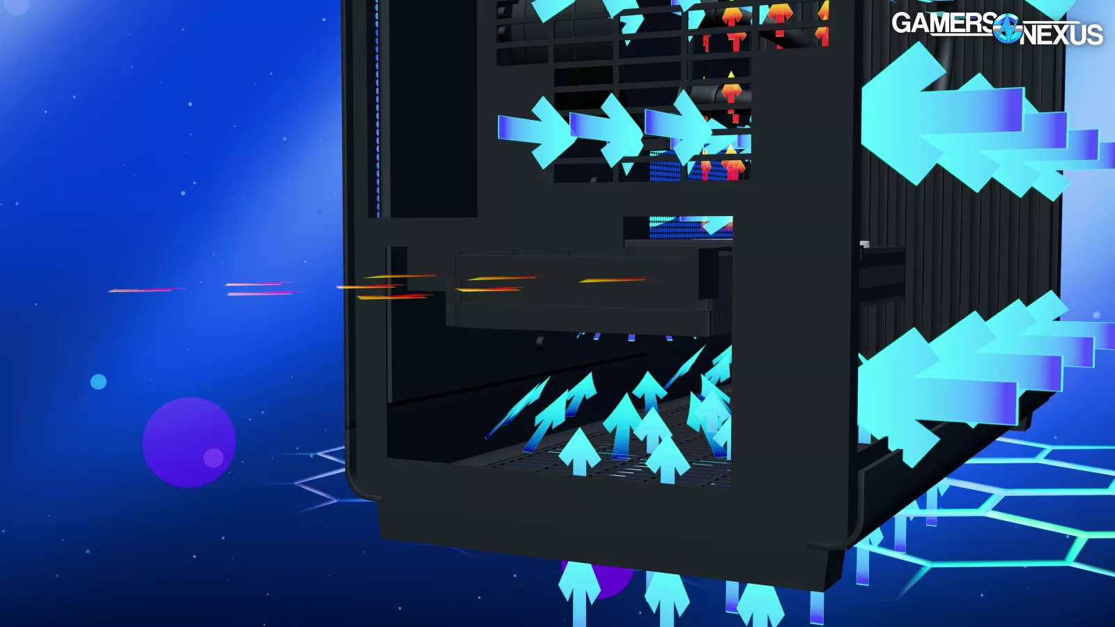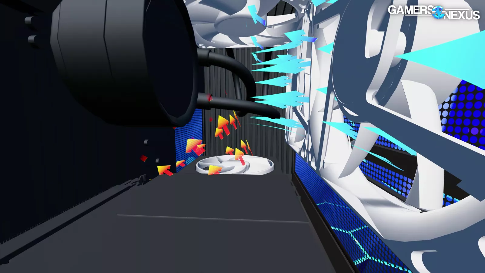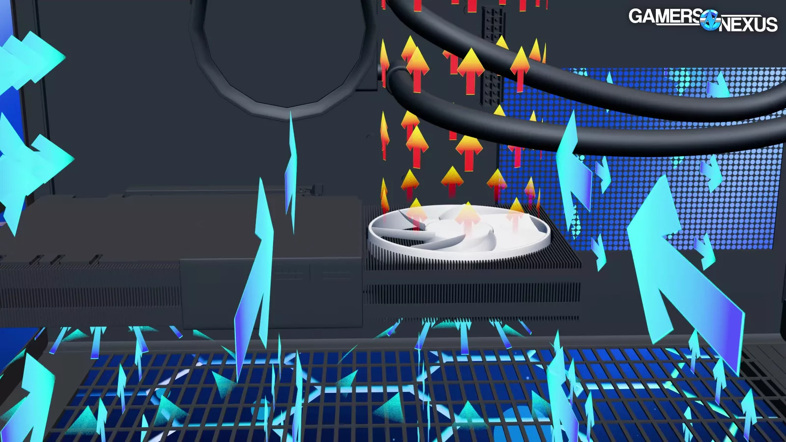 Our animation explains what we think is happening. When the system is configured with only the top exhaust fans, the system is in a negative pressure setup. In PC building terminology, this means there is more forced outflow through fans than intake, from the perspective of the case. As a result, air will naturally find its way in through effectively every hole in the case, but especially the two closest ones: The large, empty fan mount in the back and the empty mesh on the left side panel. This air flows straight in and out the liquid cooler through its fans.