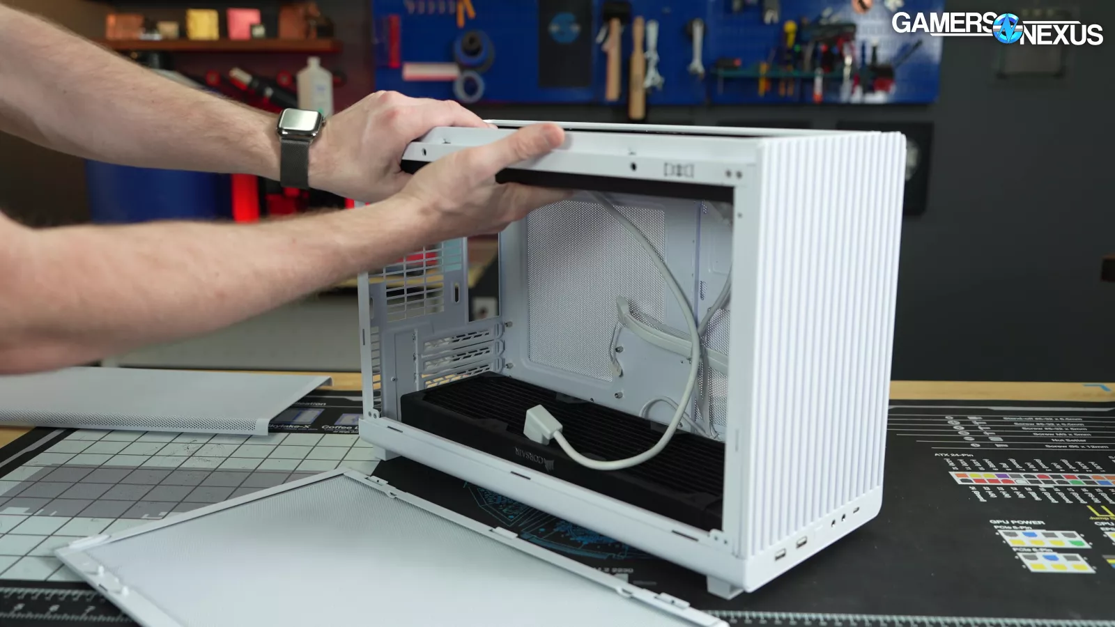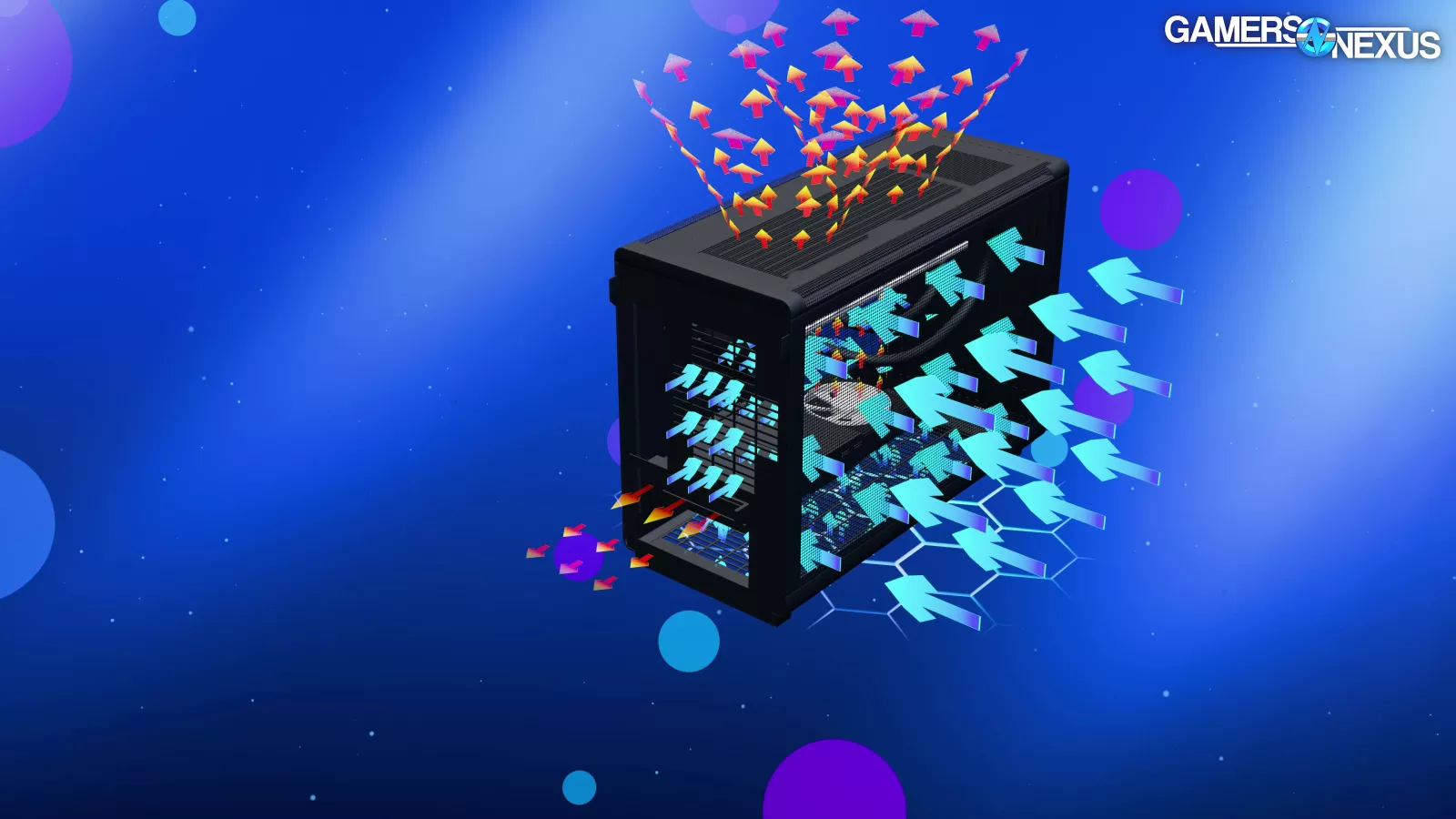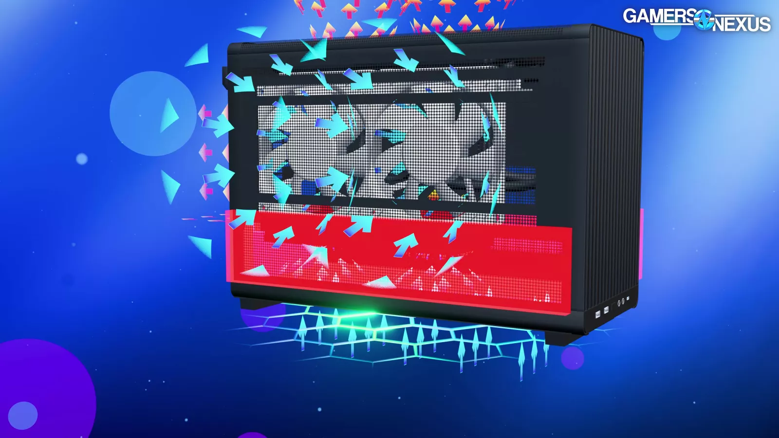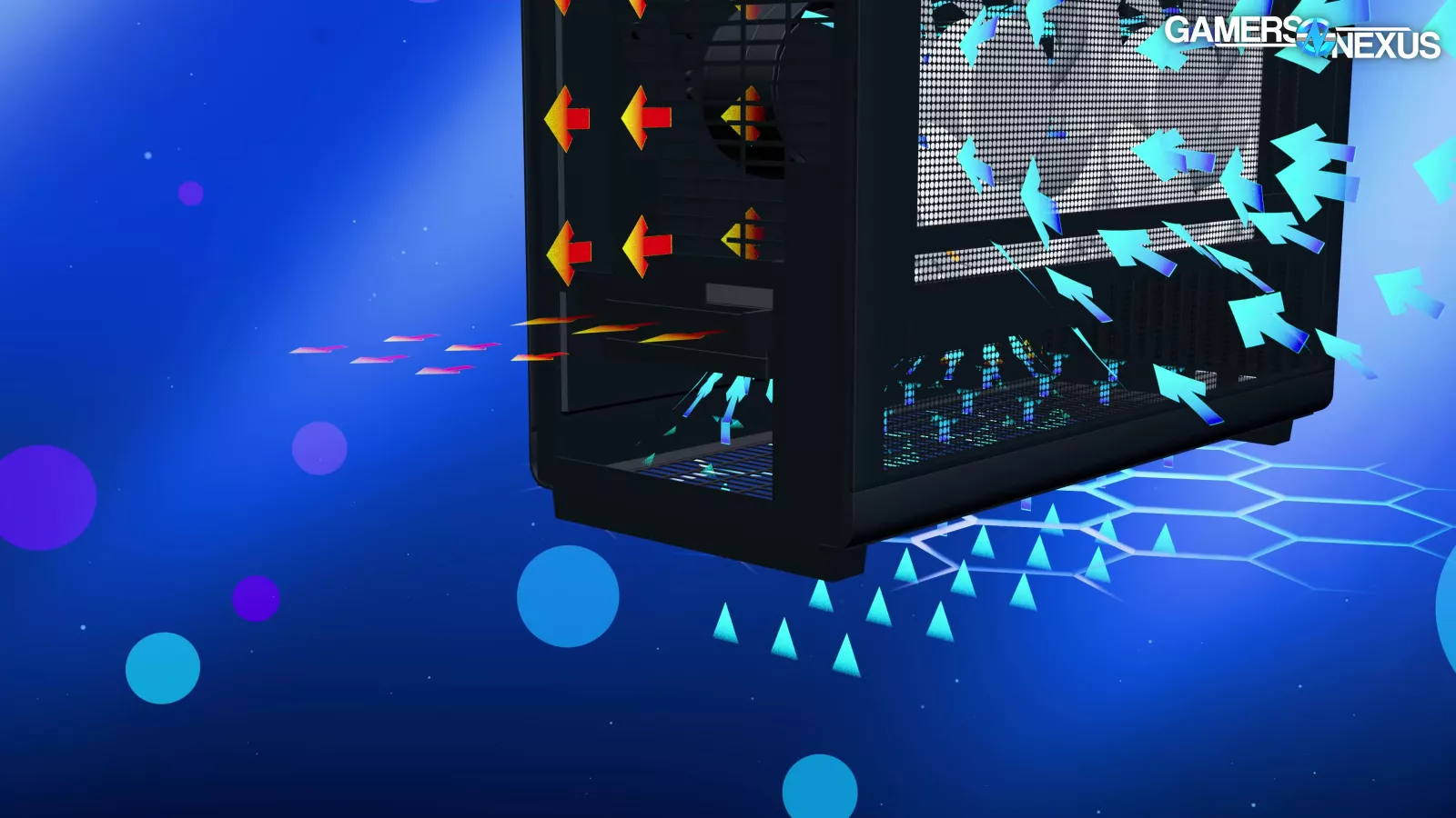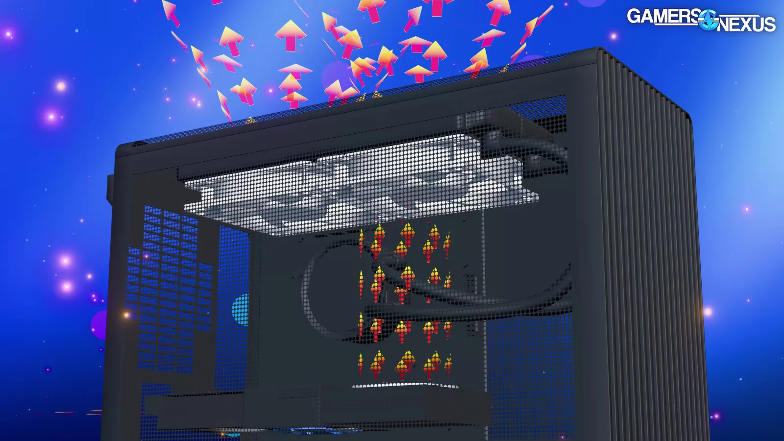 Our animation explains what we think is happening. When the system is configured with only the top exhaust fans, the system is in a negative pressure setup. In PC building terminology, this means there is more forced outflow through fans than intake, from the perspective of the case. As a result, air will naturally find its way in through effectively every hole in the case, but especially the two closest ones: The large, empty fan mount in the back and the empty mesh on the left side panel. This air flows straight in and out the liquid cooler through its fans.