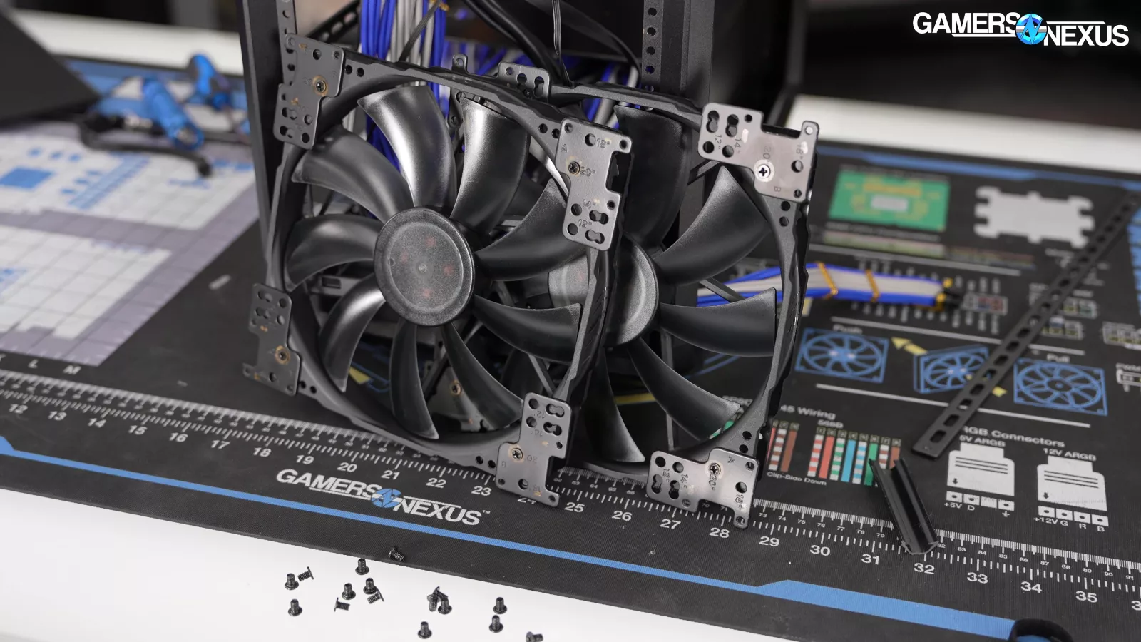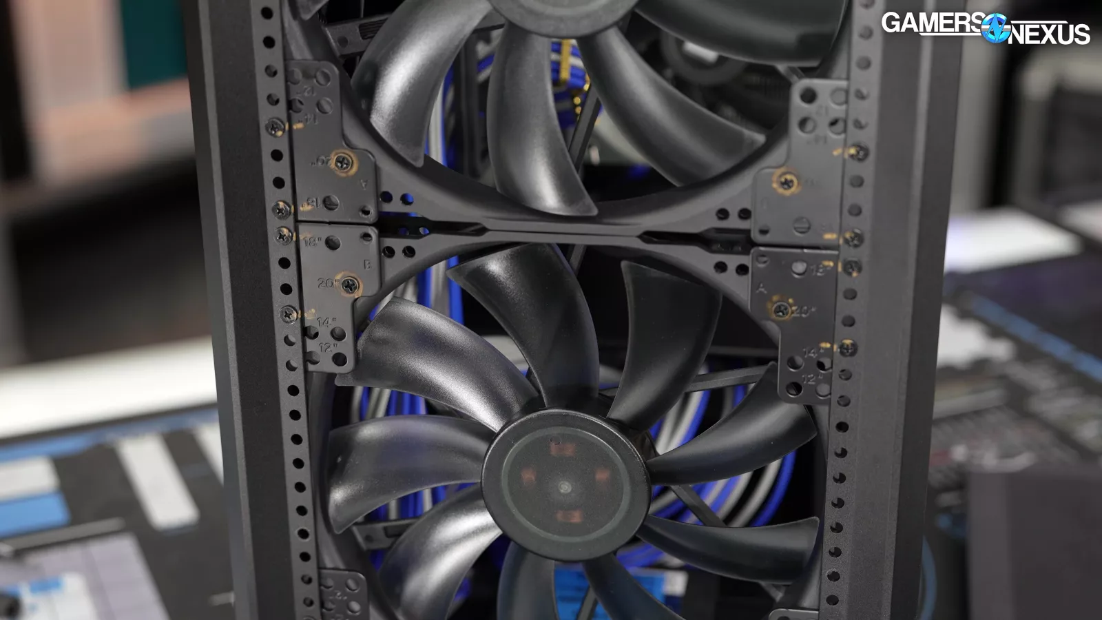 We'll start with noise normalized testing, where we step down case fan speeds inside our hemi-anechoic chamber until we hit our 27 dBA SPL target, measured one meter from the front of the case. We published a video showing our process to build this chamber previously and have gotten regular use out of it since it was built. This allows us to control our acoustic environment so that outside noise doesn’t affect our results. Test hardware like this is made possible through your support on store.gamersnexus.net.