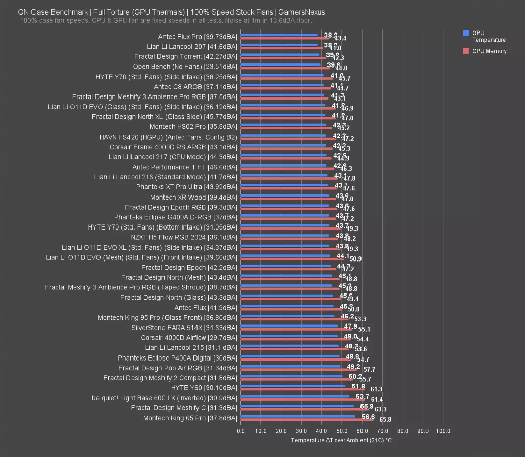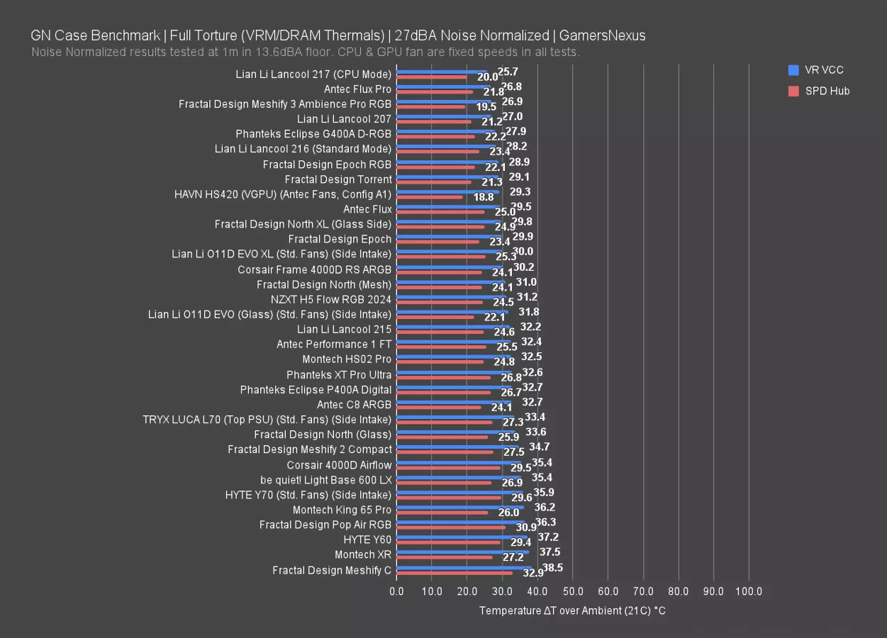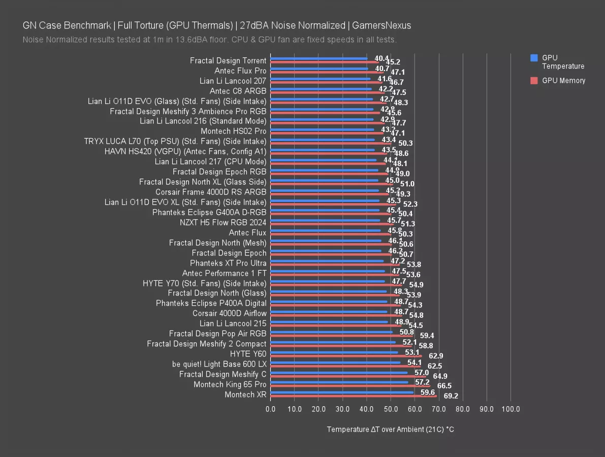 The Frame 4000D did well with a 45 degree GPU average, while the Lian Li cases again are ahead, with the 207 and 217 "GPU Mode" showing similar performance at 42 degrees above ambient on the GPU. Credit to Fractal for still having the best GPU thermal performer with the Torrent (read our review) though, tying the Flux Pro (read our review). These are much more expensive cases.