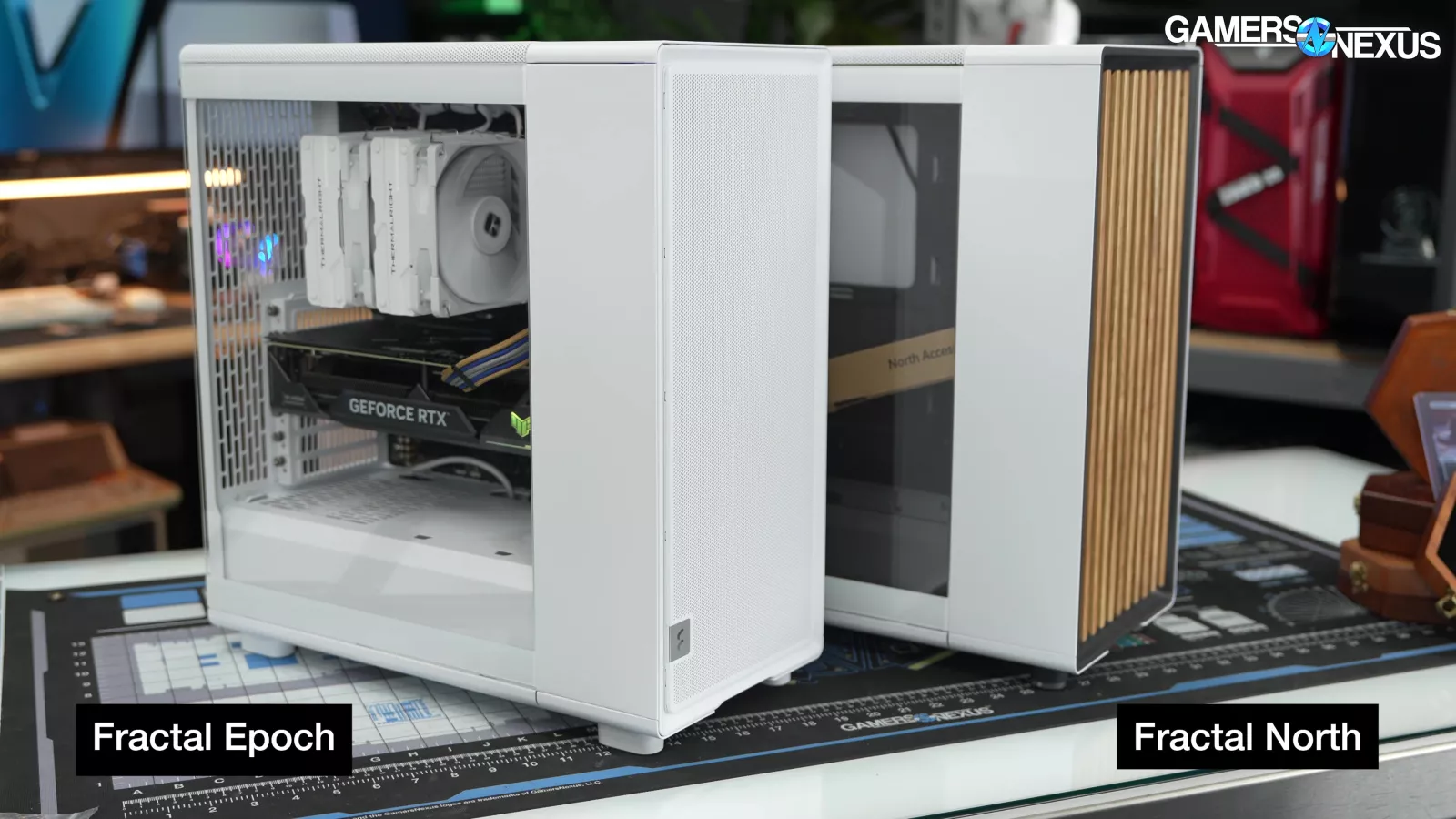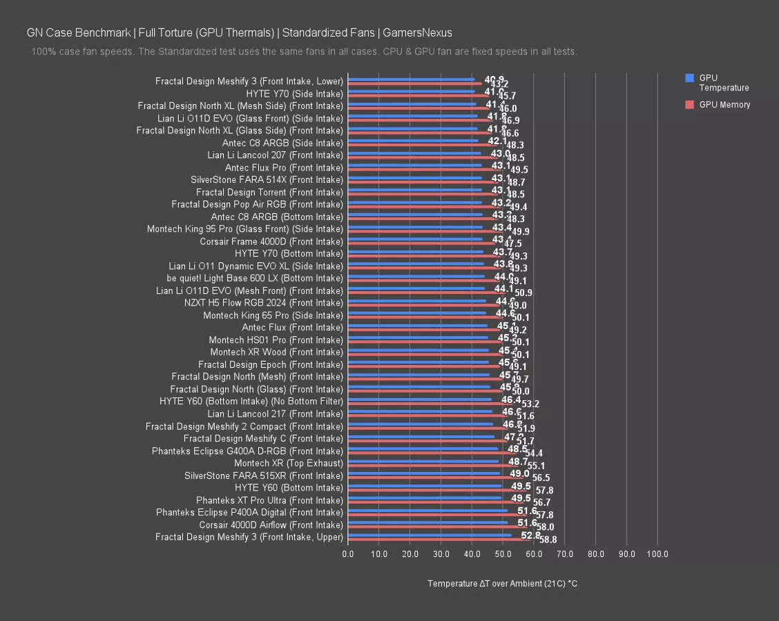 In terms of GPU thermals, the Epoch, the mesh-sided North, and the glass-sided North all averaged the same: 46 degrees above ambient. The Epoch's front panel may be cheaper, but it's not worse for thermals.