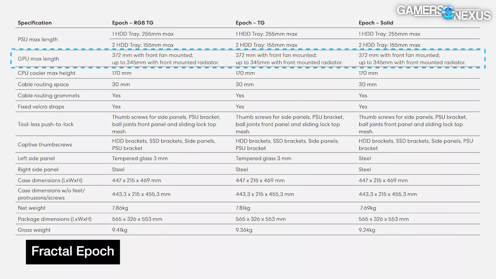| GPU max length | 372 mm with front fan mounted; up to 345mm with front mounted radiator. |