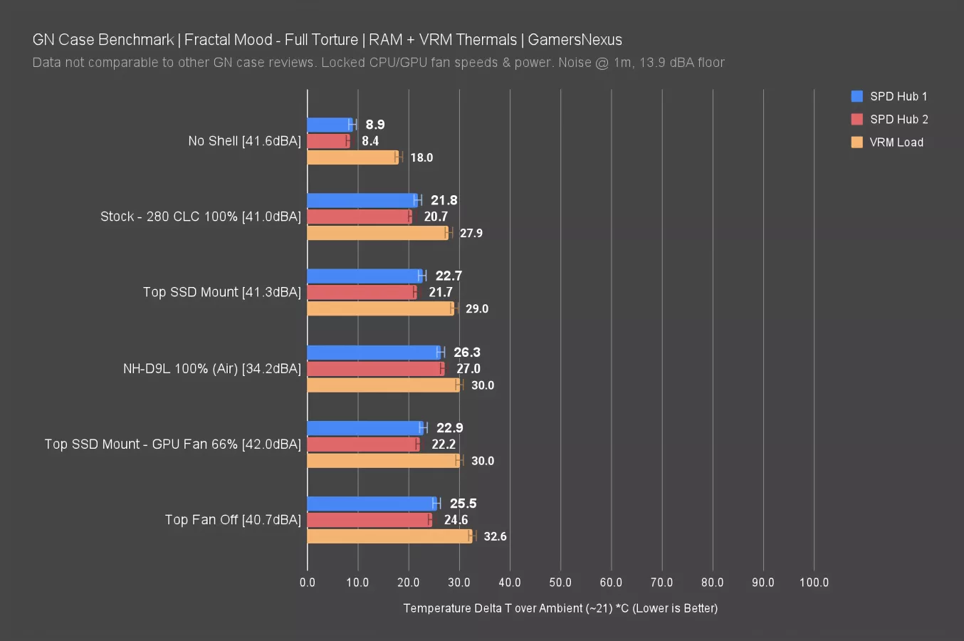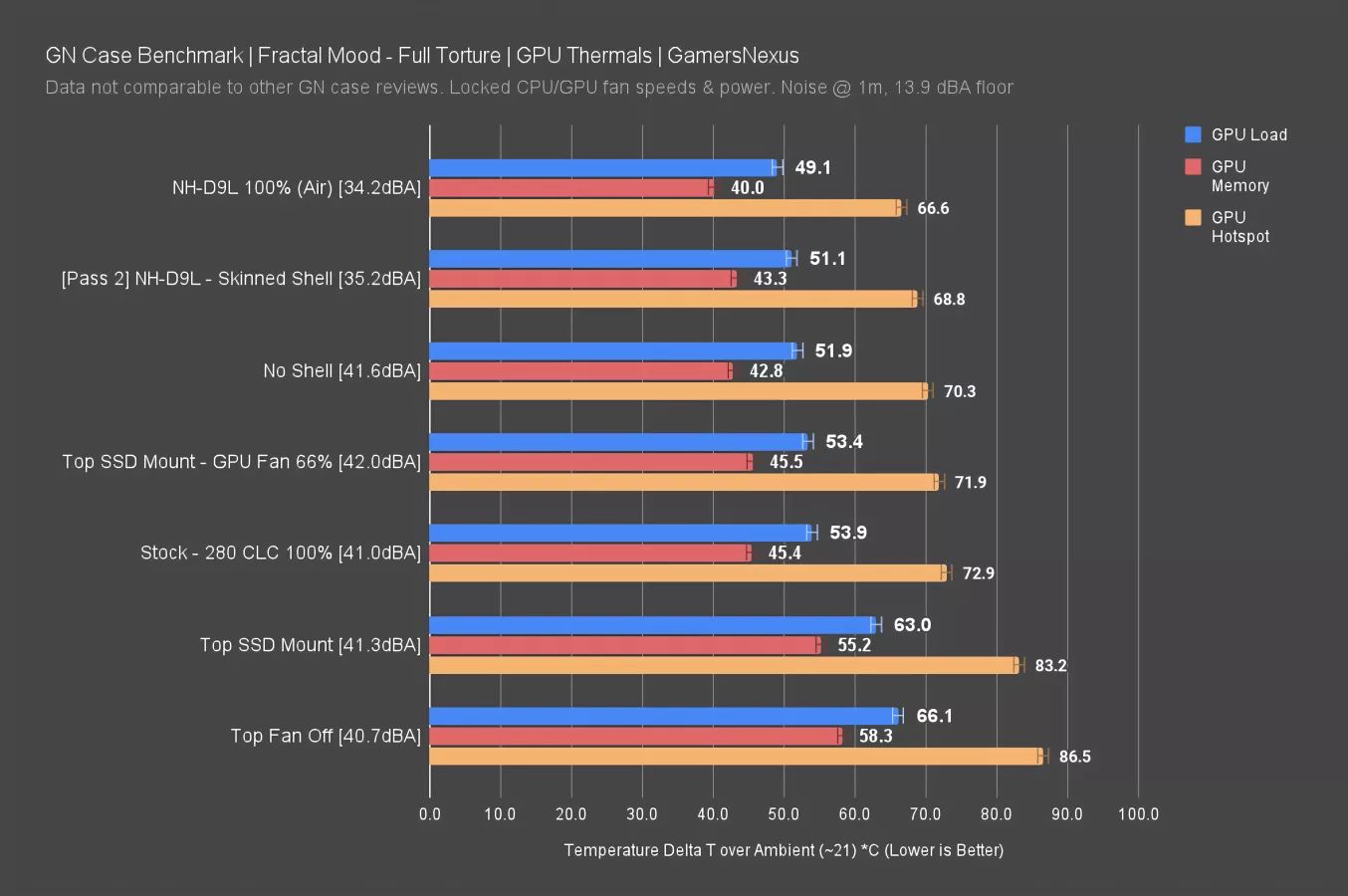Finally, we can see that the top exhaust fan is actually integral to GPU thermals, as turning it off had the GPU running 12C warmer than the stock setup, with even lower clock speeds. Fractal has poorly balanced the behavior of its two chambers.