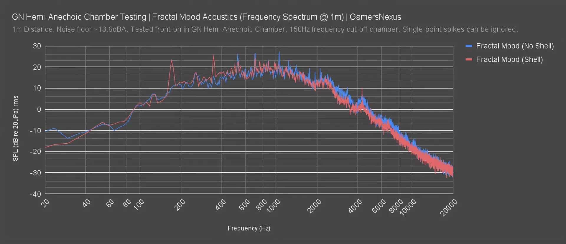 With the 280mm liquid cooler installed, the outer shell of the Mood seems to have a resonant type noise around the 180Hz area, with peaks also forming at the multiples of ~360Hz and ~720Hz. This is clearly audible in the recording, even without isolation. It’s the slow rising and falling drone that sounds something like a distant lawn mower. When the shell is removed, the lower frequency droning sound is gone. You can see that in our frequency spectrum plot, where the shell-less test, despite losing the blocking wall, is quieter in some of the lower and mid frequencies. The wall helps block some of the higher frequencies, as expected.