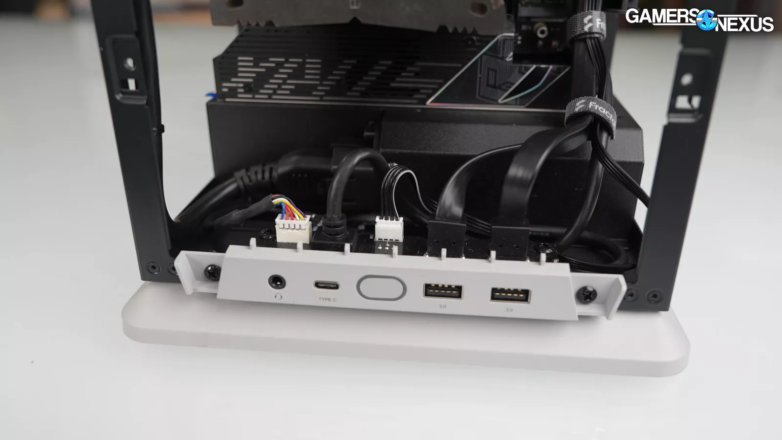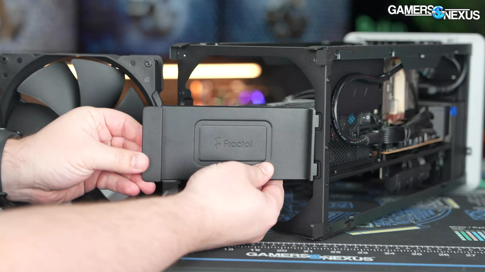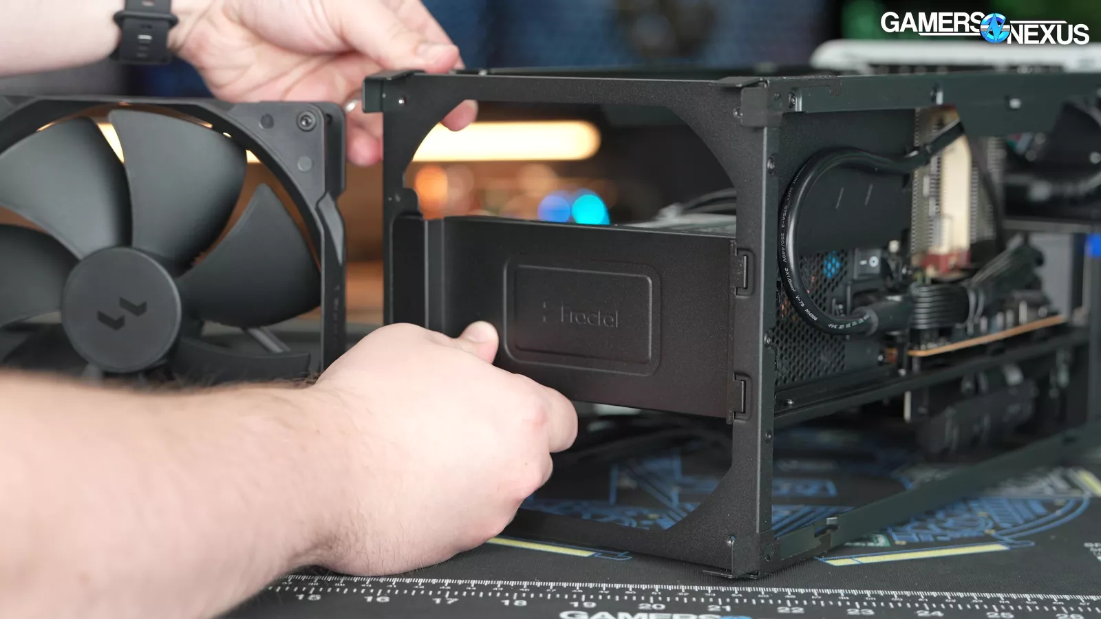 Fractal isn’t clear on what the maximum CPU air cooler height is – it’s either 114mm as shown on its webpage, or up to 120mm as shown in the manual, or 110mm as we were told in-person. Based on our measurements, it seems like 114mm is more accurate. For air-cooled tests, we used the 110mm tall Noctua NH-D9L, and there’s just a little bit of room to spare with that. If a short enough air cooler is used, a fan could be installed over the top of it using the radiator bracket. It could be an interesting solution for downdraft coolers and would hit the VRM pretty well.