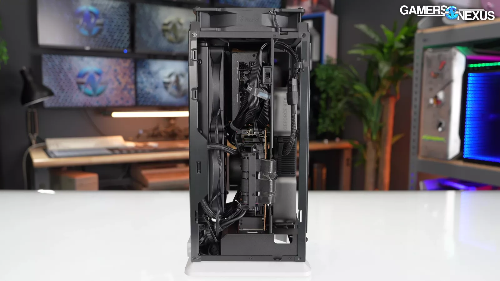 A 3-slot Founders Edition card shouldn’t fit based on Fractal’s measurements, but it actually can with minimal effort. However, there are only two expansion slots in the bottom of the case, restricting the slot-side exhaust.
