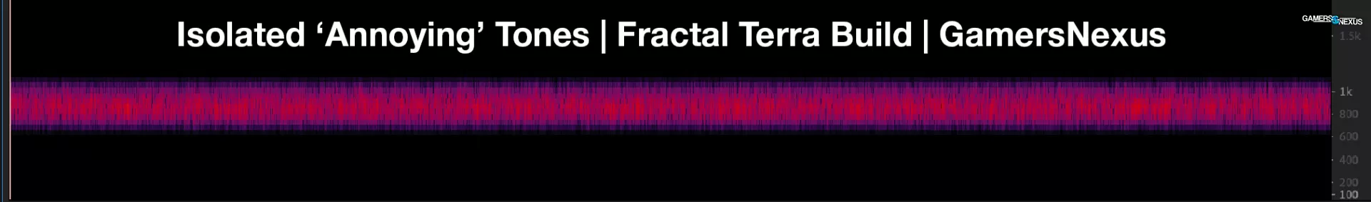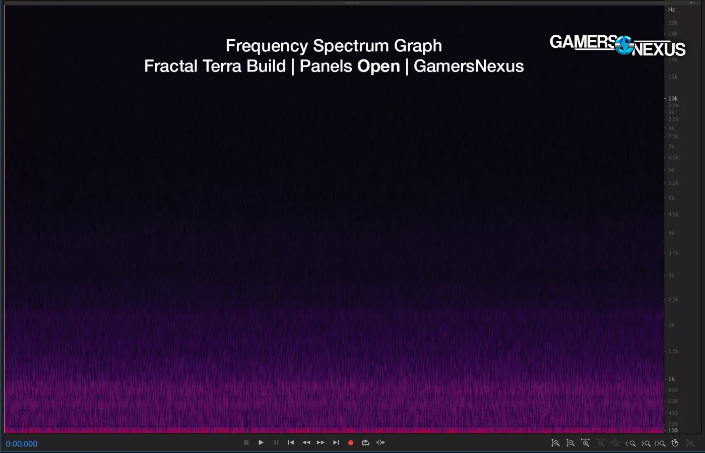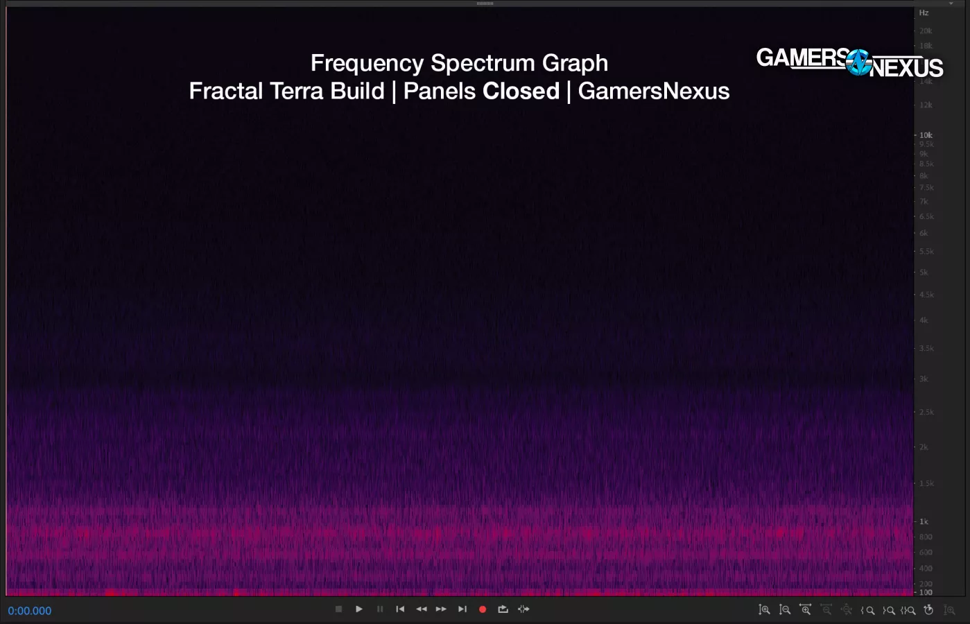 The previous chart was made with special acoustic testing software, but this next image is from something simpler: Adobe Audition, which is used for sound mixing. These are unmodified frequency visualizations. This first image shows the case with the side open. Note that most of the noise is a lower fan hum -- primarily under 200Hz. Here’s the side closed test. Notice that we have a higher volume of 600Hz, 800Hz, and 1100Hz noises now. We’ll flash between these a couple times to make it easy to see the differences. The total volume is also just higher with the sides closed in our testing with the spine biasing the CPU cooler towards the side panel, but it’s those specific ranges that make it annoying.