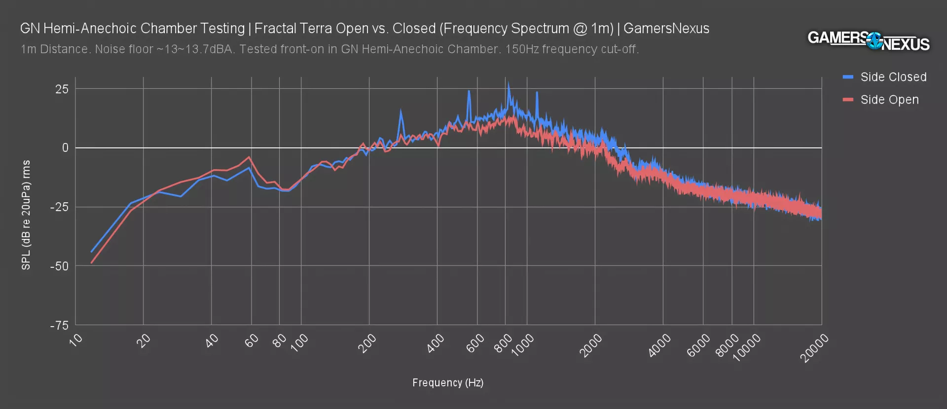 This frequency spectrum plot shows what’s going on. With the side open, the case isn’t only quieter overall despite the same fan speeds, but its noise reduction primarily comes from the 500Hz to 4000Hz frequency range. The biggest deviation is around 850Hz, with reduced but also deviating spikes from 600Hz to 1100Hz.
