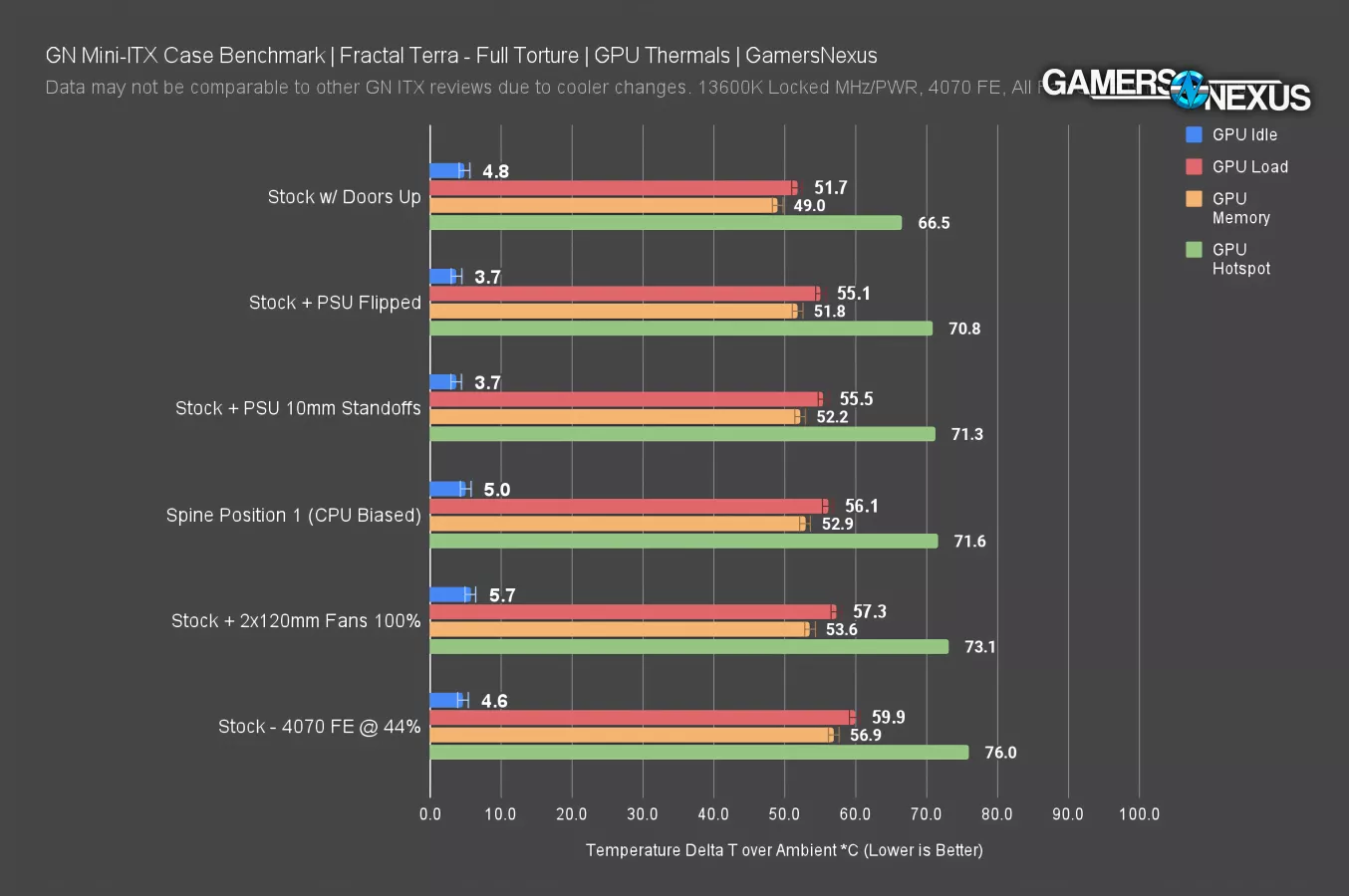 Our stock setup resulted in the worst temperatures on the chart, due to warm air recirculation in the GPU side of the case. Without any chassis fans to force it out, you actually are relying on that slow natural movement of hot air to escape through the top or through the GPU. Opening up the Terra’s gullwing doors unsurprisingly gave us the best result – 8*C lower on the GPU core and a massive 10*C lower on the hotspot reading. These are huge swings for GPU thermals, showing the restrictions caused by this style of door ventilation. A higher porosity would help Fractal here.