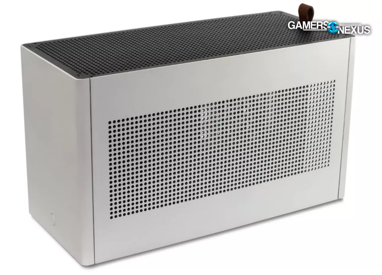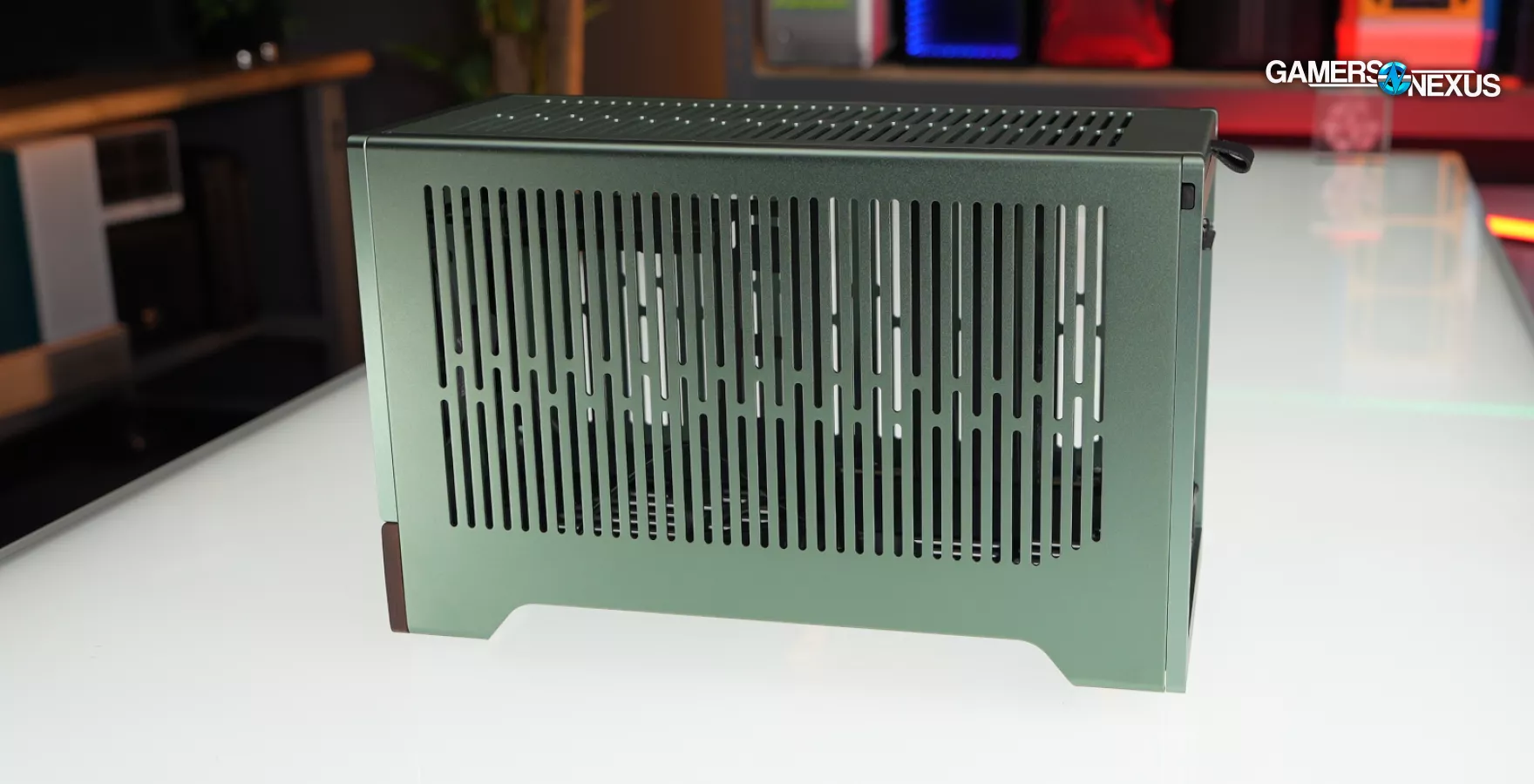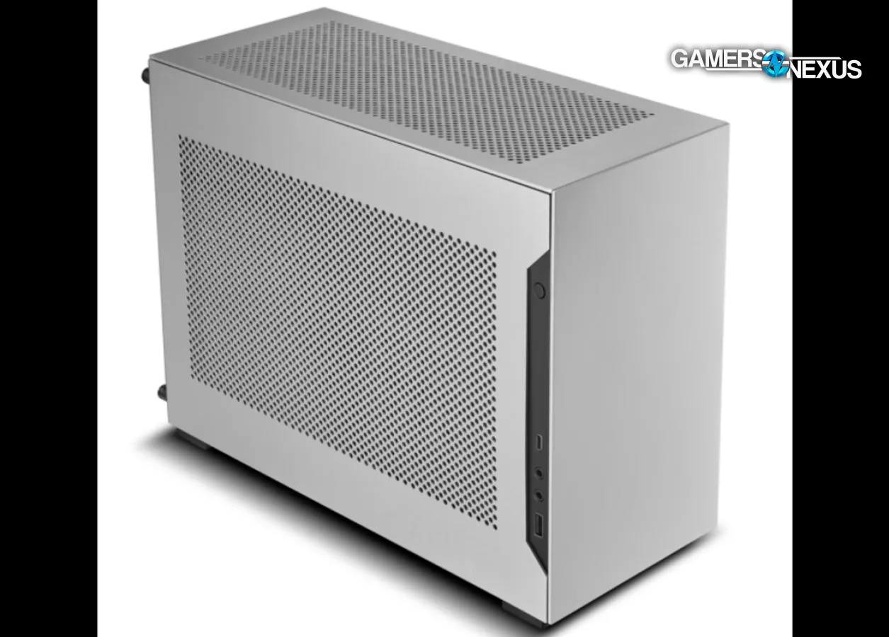 Today, we're reviewing the Fractal Terra mini-ITX case. It has some extremely unique features, but also some extremely unique noise characteristics as a result of the slat design on the panels. In the video, you'll notice that when we replace the side panel with something perforated hexagonally or circularly, the noise profile of the case is significantly better -- it’s not only quieter, but of a more tolerable frequency. We’ll show numbers for that in our noise chamber later. All the audio comparisons will be in the video.