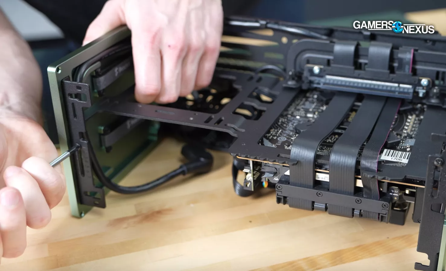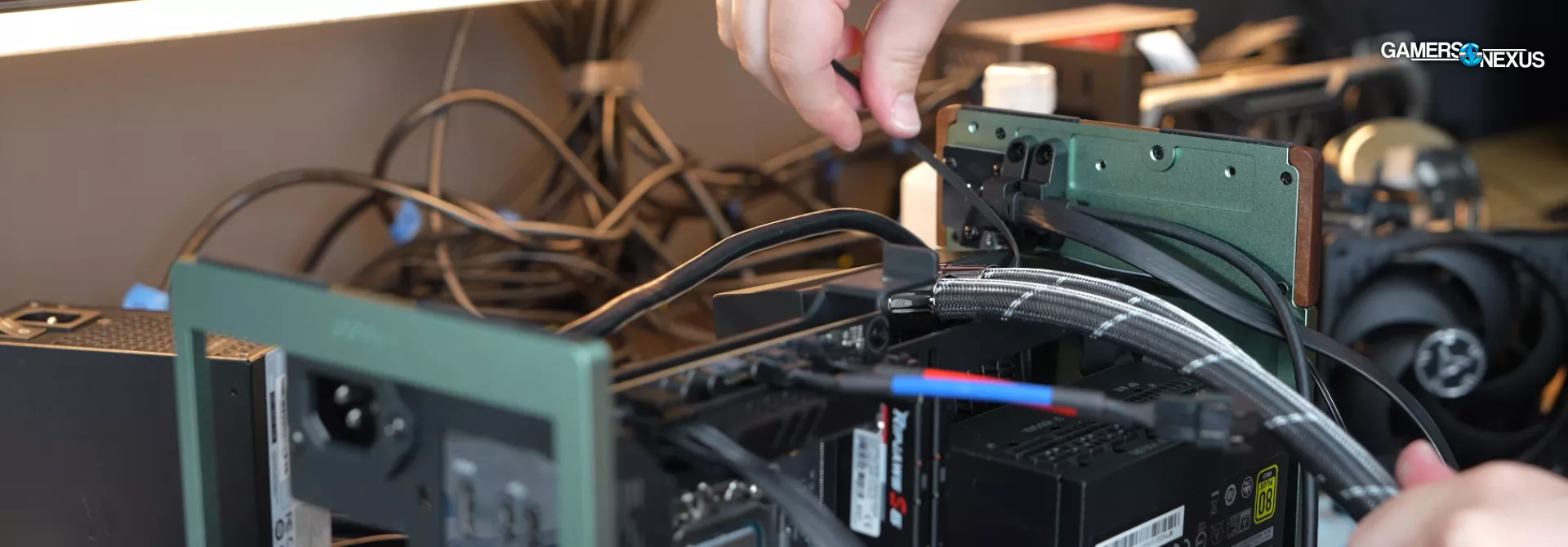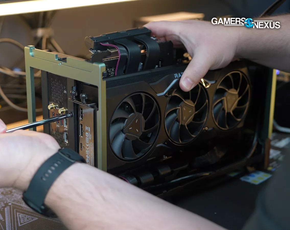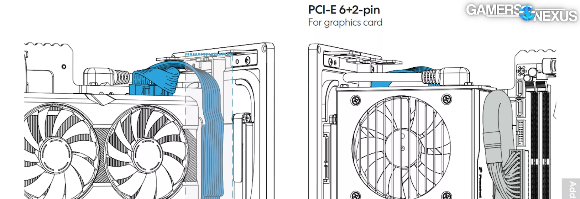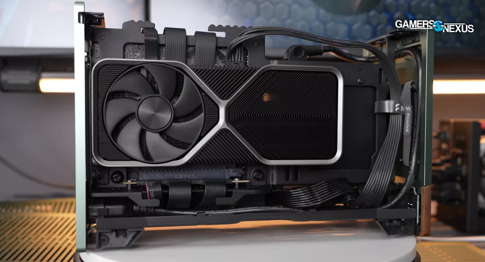 We test fit a few other GPUs to see what fit issues may come up. The reference RX 7900 XTX fit with the spine in position 3 without issues. The tallest card we had on hand was this ASUS Strix Vega 64 at 139mm, and it fit with the spine in position 3 as well, but uses nearly all of the vertical space. The RTX 4080 FE required biasing the spine farther towards the CPU side, reducing the cooler clearance significantly. GPU power cable management can be tricky on the taller cards, and the Corsair SF1000L’s stock 12VHPWR cable is so stiff that we weren’t comfortable forcing it to bend enough to fit. If you’re interested in using a GPU this tall, you’ll need a more flexible individually-sleeved cable or some kind of 90 degree adapter.
