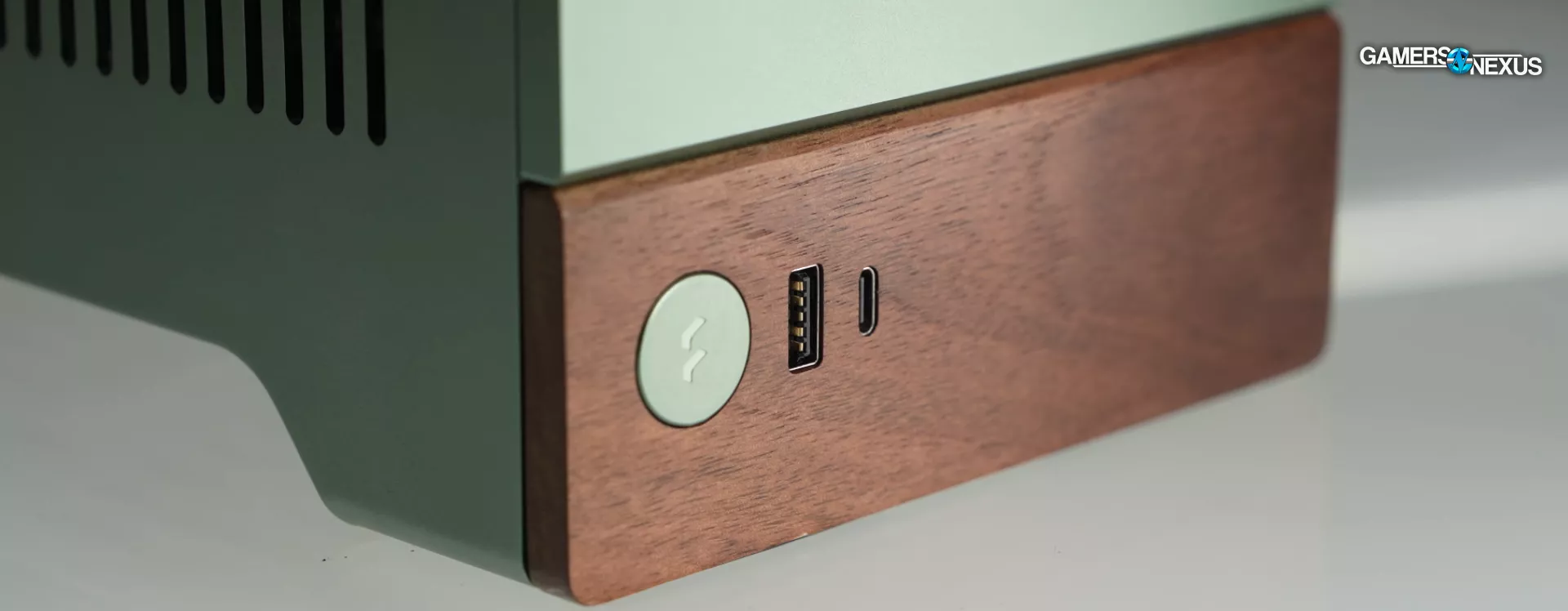 Time to get into fit & finish: The Terra’s overall build quality and finish are good. The front panel features a small strip of wood along the bottom where the limited front I/O is located -- the type of wood depends on the case color. The power button is color-matched aluminum, which is a nice detail. Front IO itself is extremely limited and doesn’t include audio, which we’d like to have seen.
