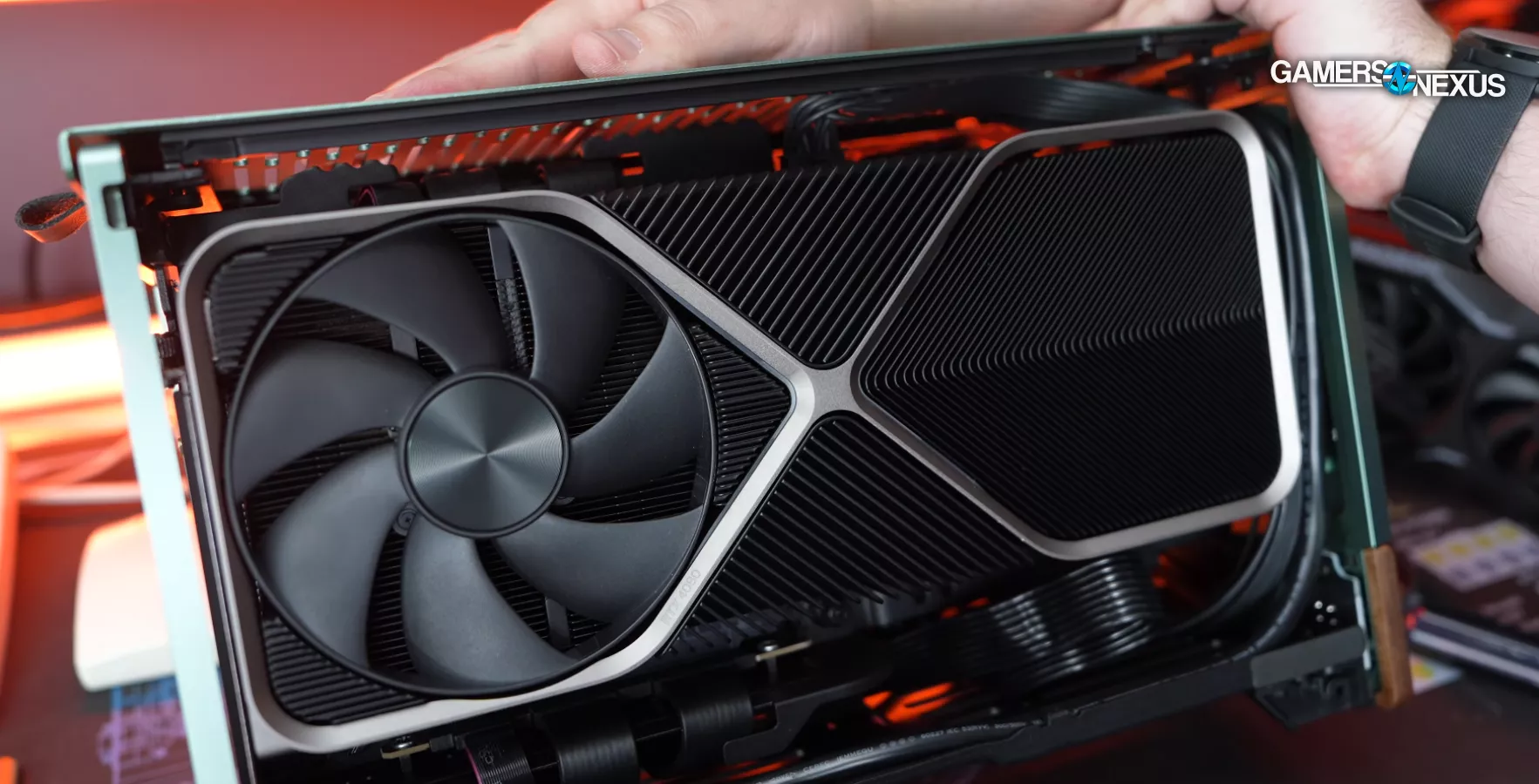 That would have the GPU clearance at 43mm depth, which would fit a 2.0-slot card with about 1-3mm of clearance, depending on tolerances. The maximum GPU cooler space is 72mm, which would have the CPU clearance at a heavily reduced 48mm. A 4090 FE is about 61mm wide - but it wouldn’t clear vertically. More on that later.