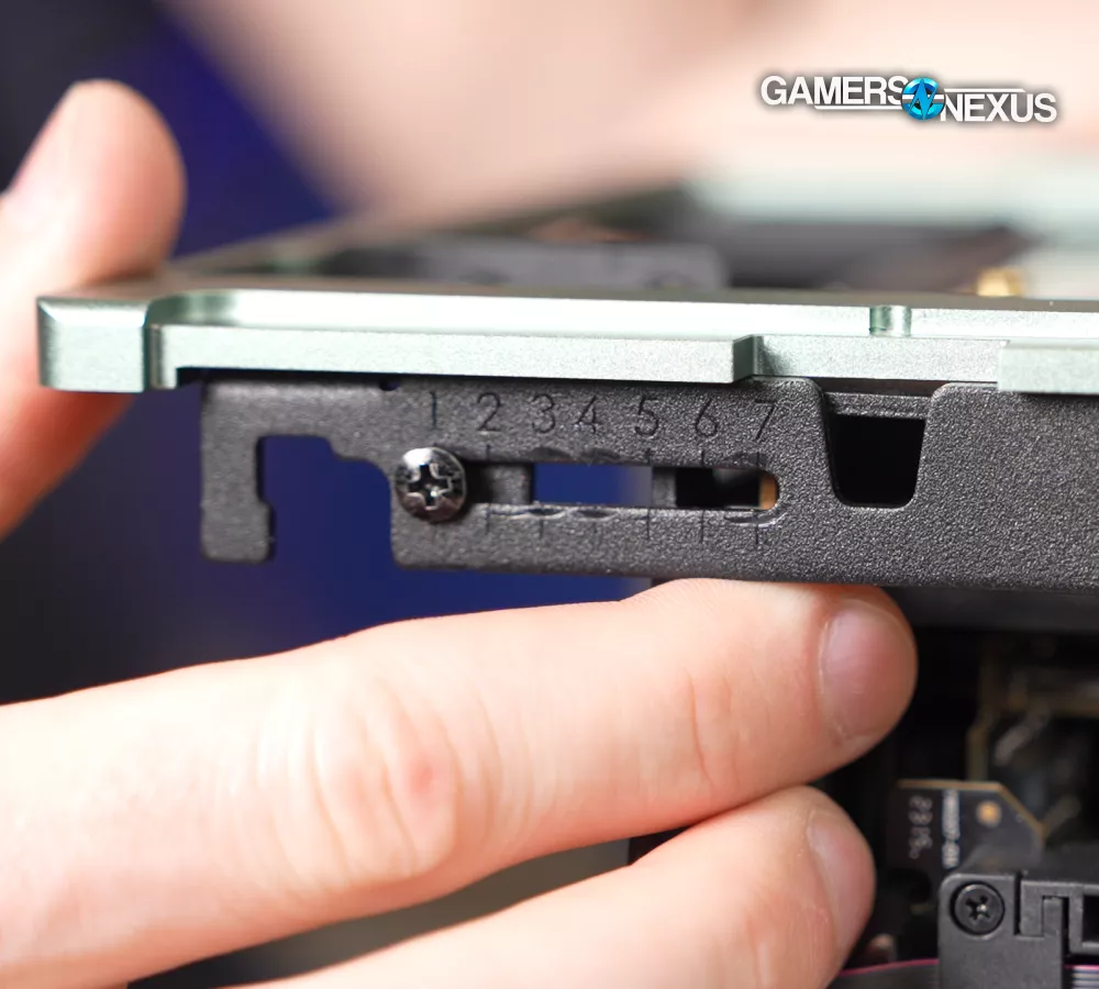 Sliding the spine over to position 1 for as much room on the CPU side as possible didn’t impact CPU thermals to any meaningful degree, staying within error; however, it did benefit acoustics greatly. More on that soon.