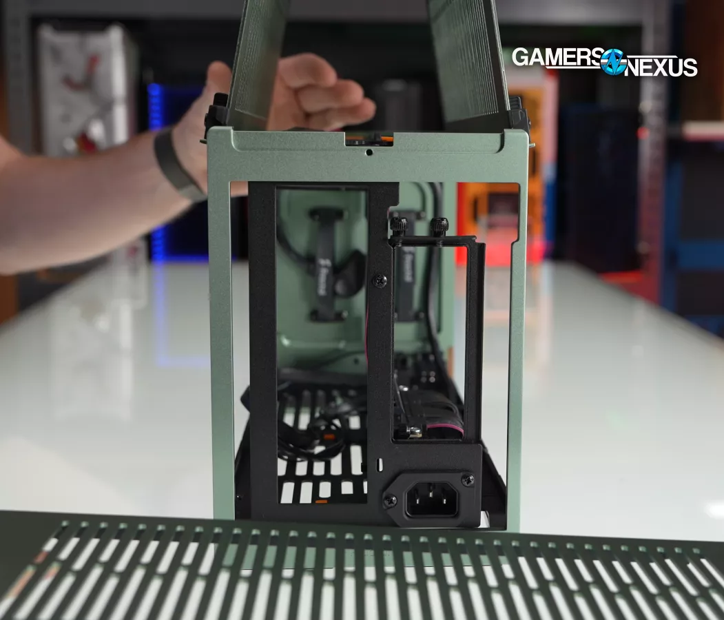 Thermals were mostly fine, with the vents in the chassis being open enough to be adequate. The support for 120mm liquid coolers feels really shoehorned in there and not very thought out. This is primarily an air cooling case, and we’d like to see a spot added for at least one exhaust fan somewhere to get the hot air out. In our testing, it was best to minimize the space on the GPU side to cut down on warm air recirculation. Adding the 10mm PSU standoffs helps for flow-through GPUs too.