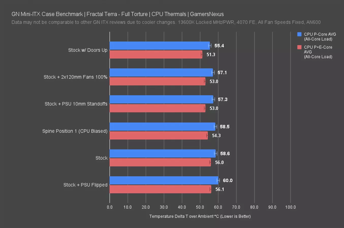 Here’s the first chart. Under a full system torture workload at steady-state, the P-Cores averaged 58.6 degrees Celsius Delta T over Ambient. The full all-core average was a little lower, since E-Cores pull less power and run cooler. To determine how much the side panels are restricting air, we next tested with the side doors fully opened: Here, the P-Cores dropped by 3 degrees, so that should be considered our best possible outcome with this setup. The difference is greater with the GPU in a moment.