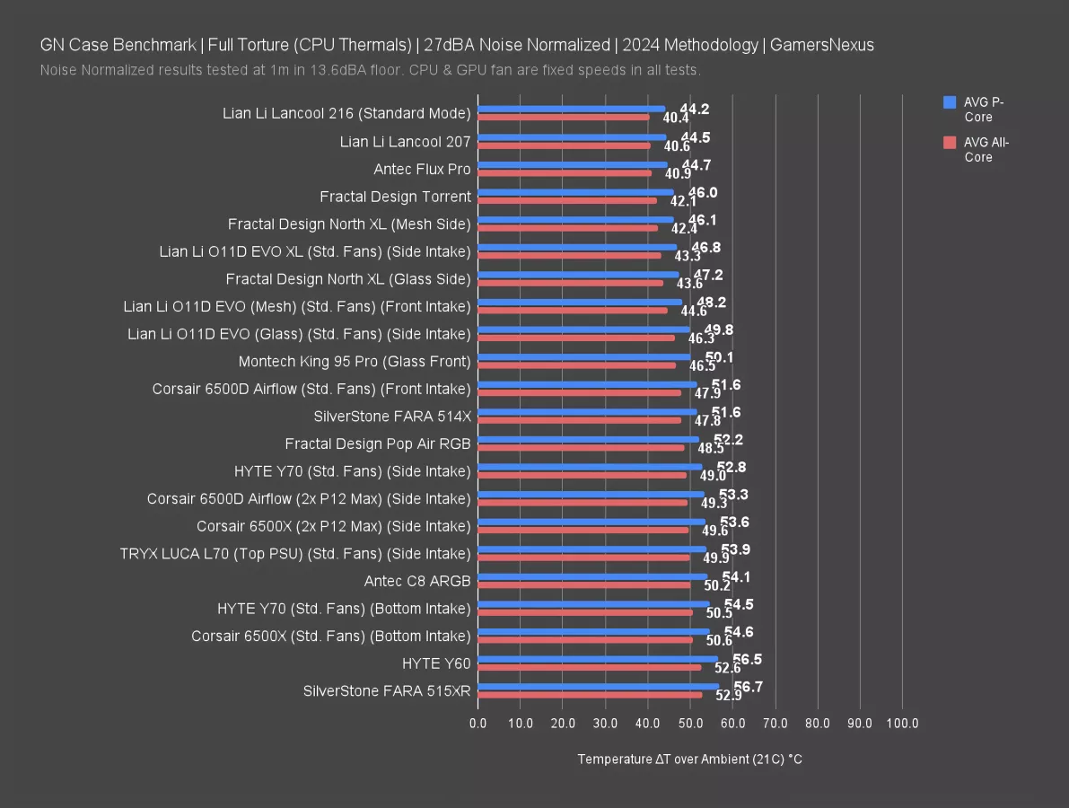 The 207 is a loud case with all fans at full speed, but we'll start with noise normalized results. For this testing, all case fans are lowered to reach a target noise level of 27 dBA measured at 1 meter in our hemi-anechoic chamber, with CPU and GPU fan speeds controlled and constant.