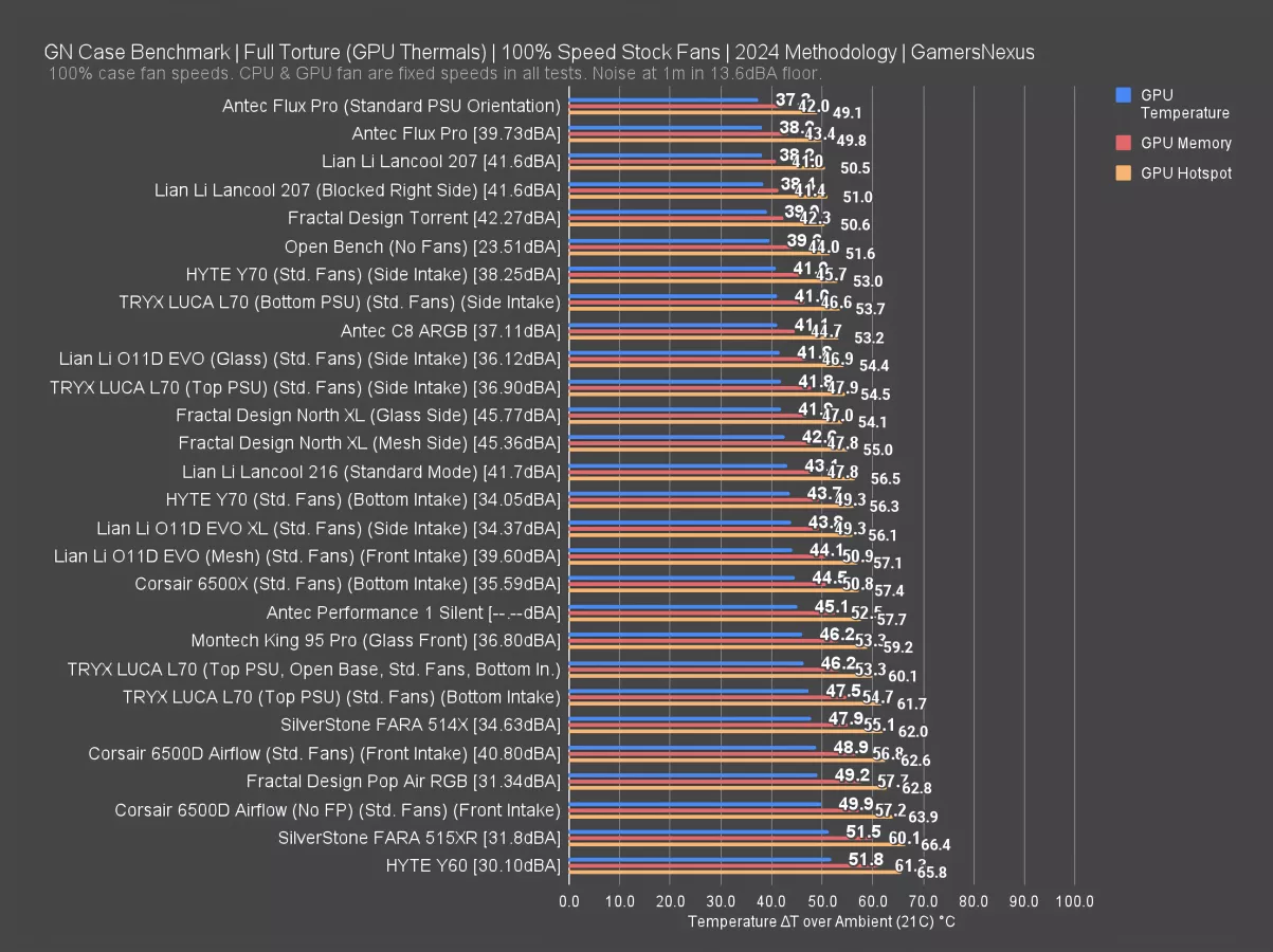 Our standardized fan tests use three Noctua fans, always the same ones: two 140mm front intake, and one 120mm rear exhaust, all at 100% speed. We regularly explain the limitations of this testing. You can learn more in our methodology piece here. This allows us to remove stock fans as a variable and compare just the enclosures. With cases like the 207, the comparison is theoretical (since it doesn't make any sense to replace the stock fans), but people request it, so we wanted to provide the data.