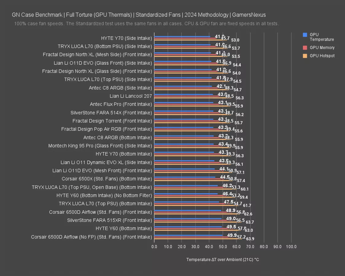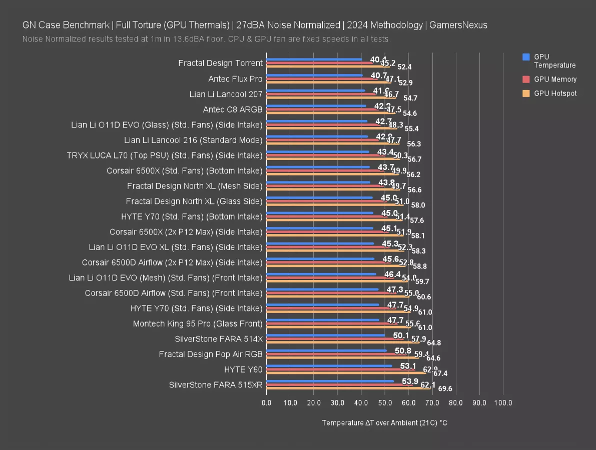 The GPU temperature averaged 42 degrees above ambient, 47 on the memory, and 55 hotspot. That's one degree better than the 216 in each category, but still close. Impressively, the Fractal Torrent remains the leader in this particular test. That’s not always true, but it is here. It has its own bottom intake fans that feed the GPU directly, which help.