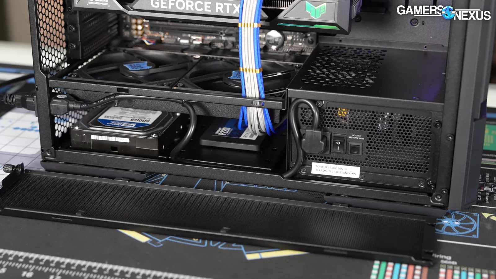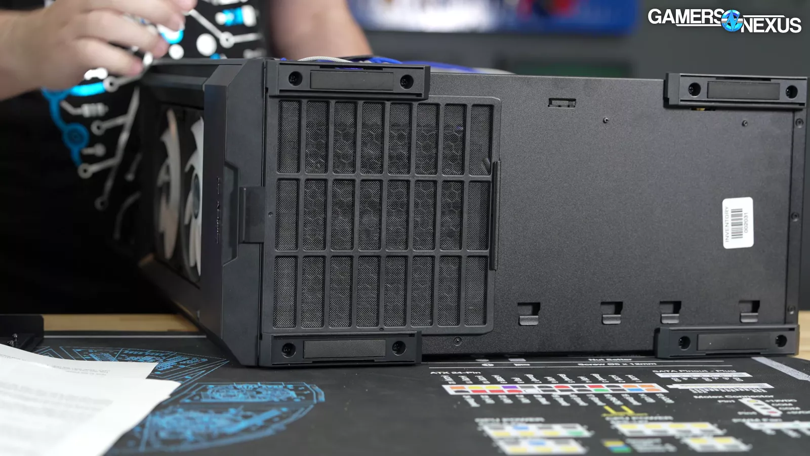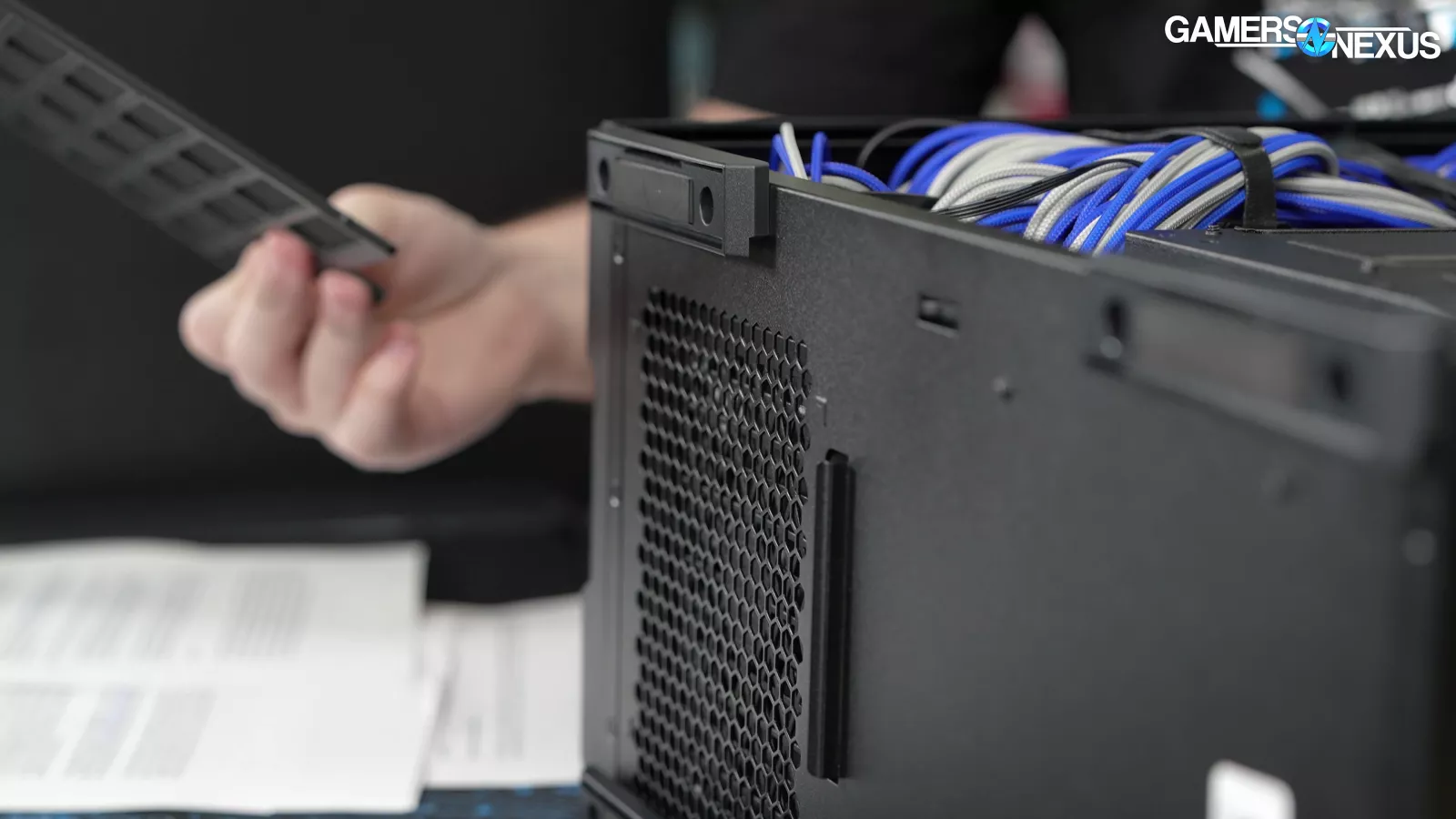 In another major concern, in Lian Li’s quest to move the power supply, it has overlooked both cabling and cooling considerations. With the bottom filter installed, which we’ll come back to, the power supply is given mere millimeters to breathe with a bottom-oriented fan. We don’t currently run power supply thermals during our testing; however, this will cause the power supply to heat up, objectively, and it may result in the PSU fan running at a higher RPM (if it is a power supply that bases fan speed on any internal temperatures).